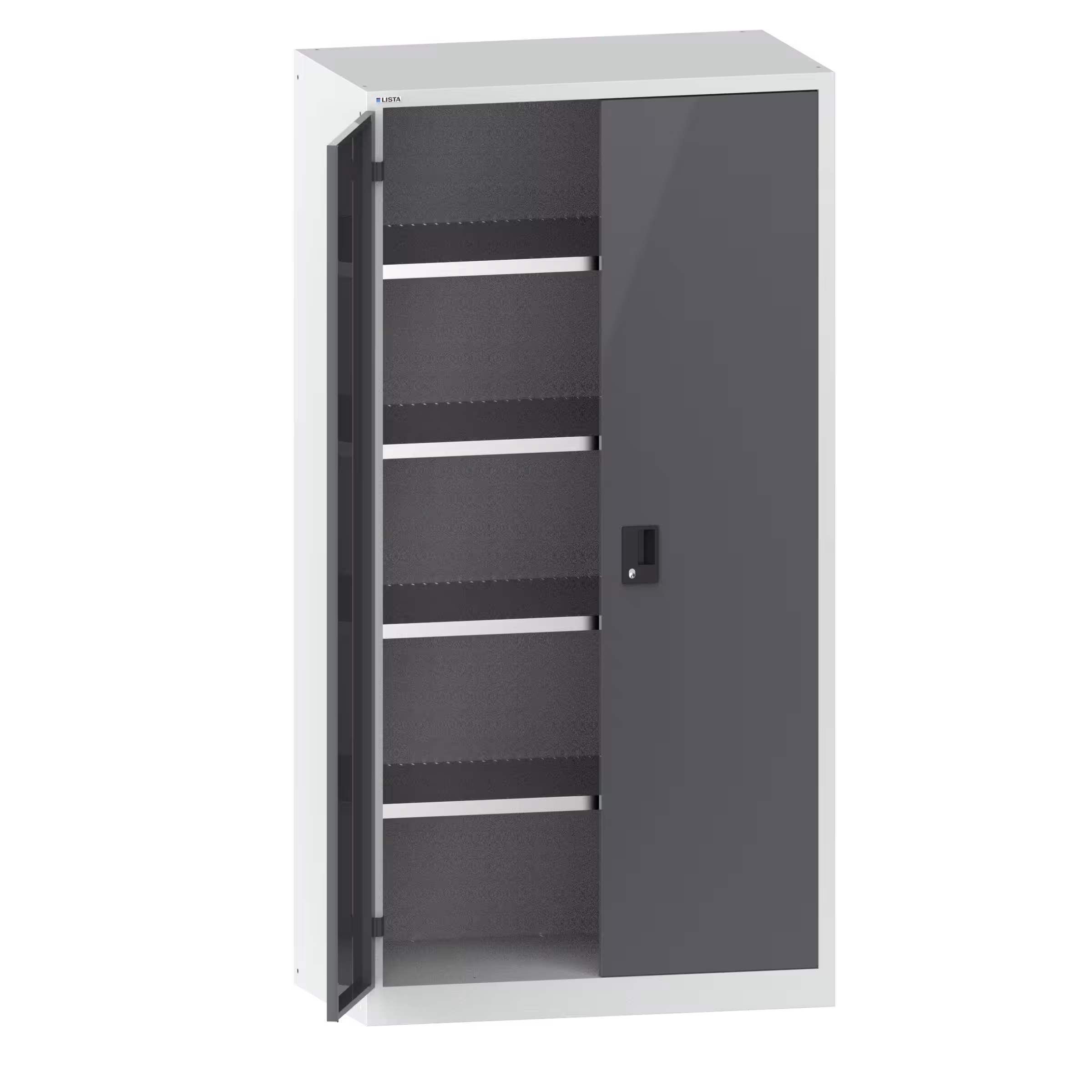 Flügeltürschränke: Die Schränke sind je nach Modell ausgestattet mit: Verstellböden verzinkt, 30 mm stark, Tragkraft 60 kg. Auszugböden und Schubladen lackiert, Anthrazitgrau, RAL 7016, Tragkraft 50 kg