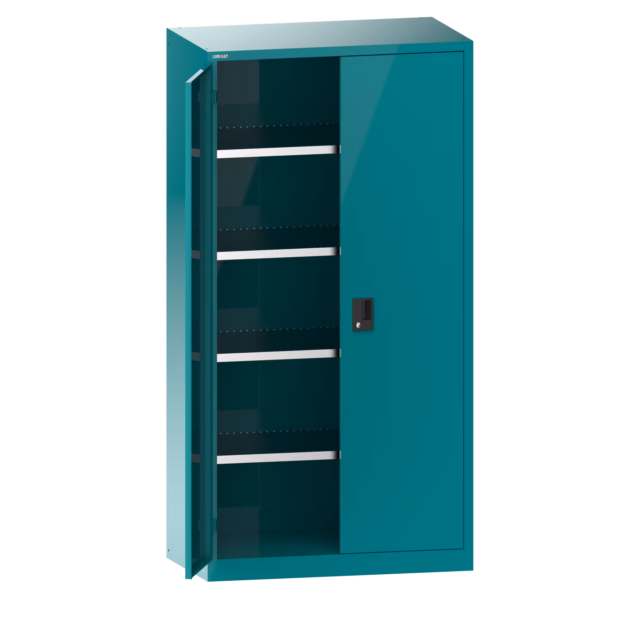 Flügeltürschrank mit 2 Vollblech-Türen Scharnierlagerung (BxTxH) 1000x580x1950mm 4 Verstellböden KEY Lock Türkisblau RAL 5018