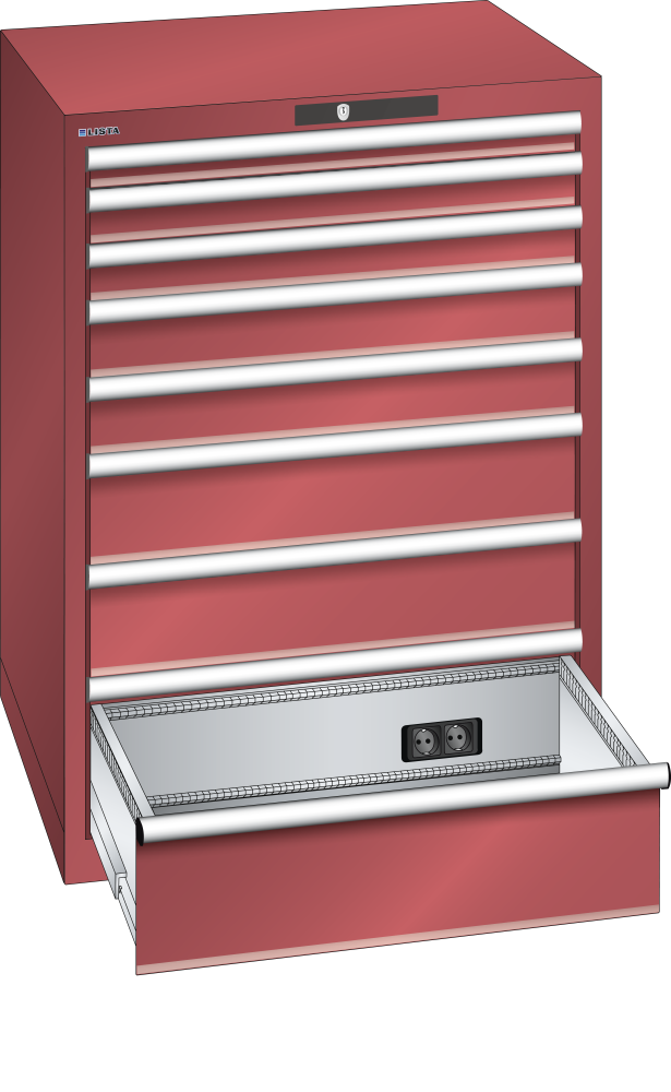 Schubladenschrank 36x36E (BxTxH) 717x725x1000mm 8 Schubladen (1x50/2x75/2x100/2x150/1x200) 75kg Typ D 2x230V RFID Lock Feuerrot RAL 3000