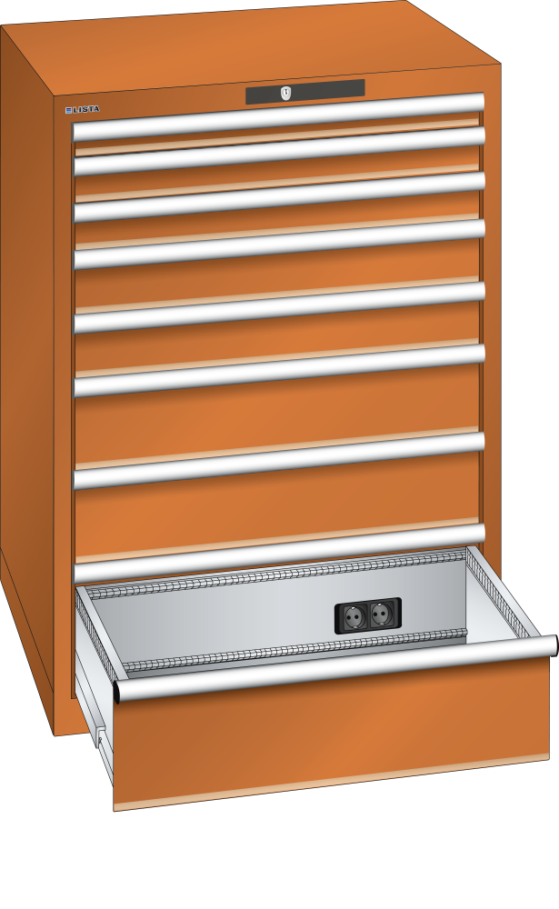 Schubladenschrank 36x36E (BxTxH) 717x725x1000mm 8 Schubladen (1x50/2x75/2x100/2x150/1x200) 75kg Typ D 2x230V RFID Lock Orange RAL 2004