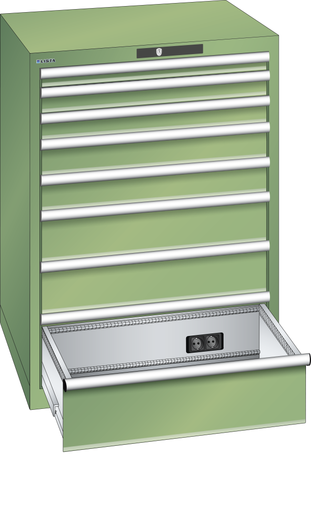 Schubladenschrank 36x36E (BxTxH) 717x725x1000mm 8 Schubladen (1x50/2x75/2x100/2x150/1x200) 75kg Typ D 2x230V RFID Lock Resedagrün RAL 6011