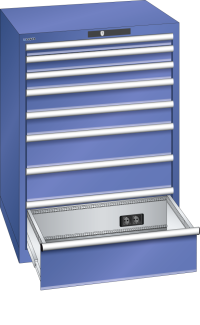 Schubladenschrank 36x36E (BxTxH) 717x725x1000mm 8 Schubladen (1x50/2x75/2x100/2x150/1x200) 75kg Typ D 2x230V RFID Lock Signalblau RAL 5005