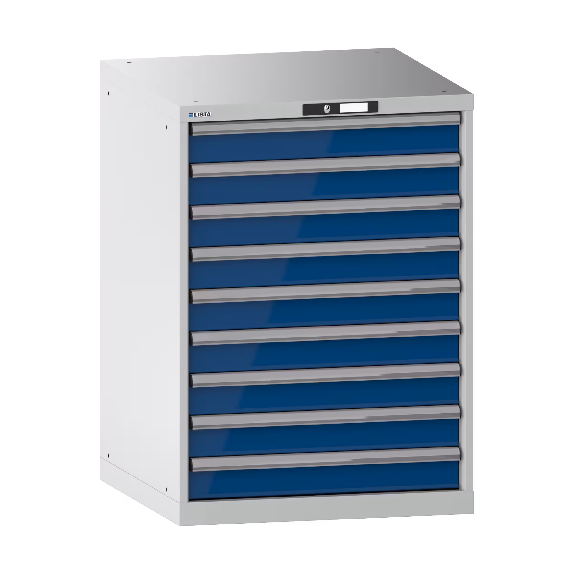 Schubladenschrank 36x36E (BxTxH) 717x725x1000mm 9 Schubladen (9x100) 75kg KEY Lock Lichtgrau RAL 7035 / Signalblau RAL 5005