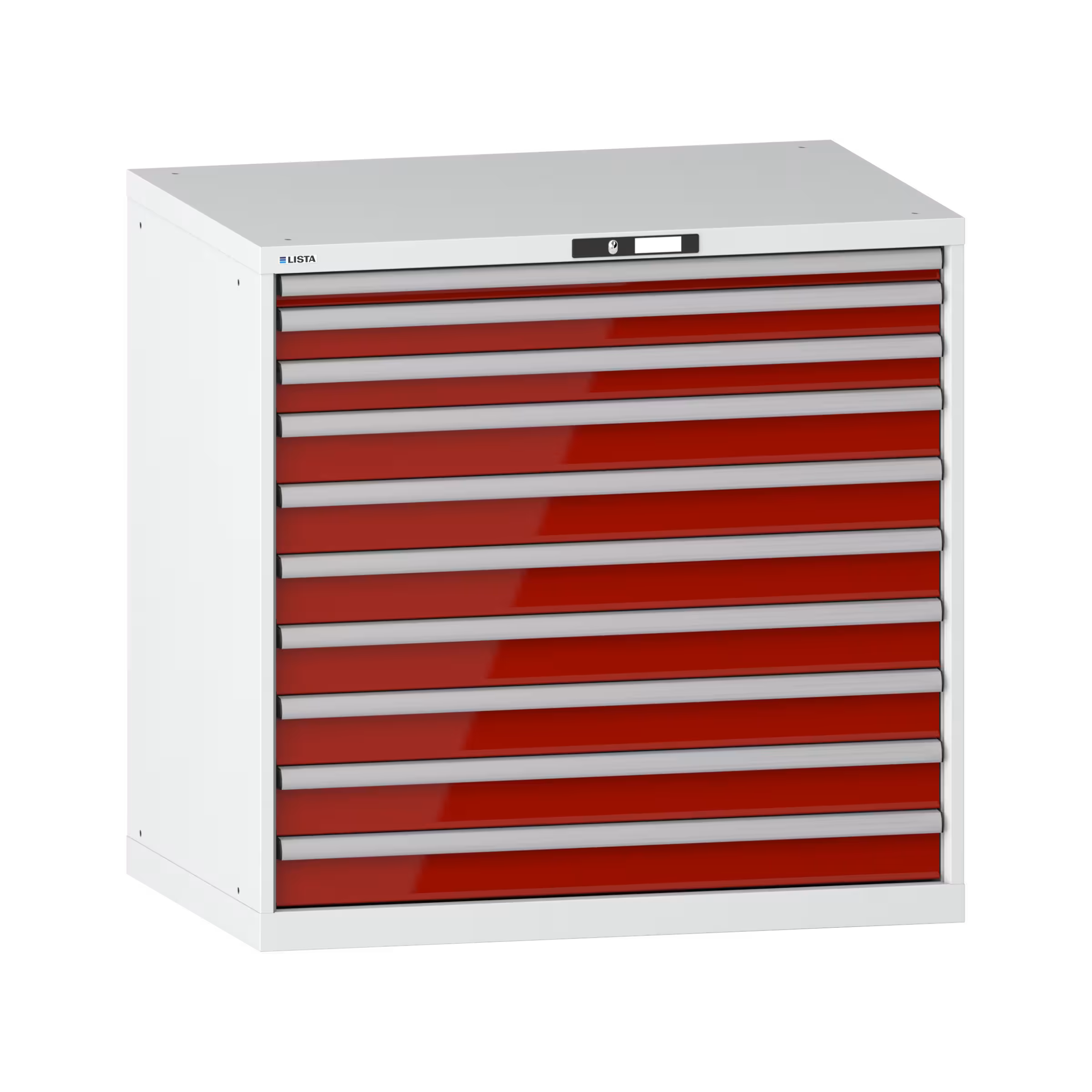 Schubladenschrank 54x36E (BxTxH) 1023x725x1000mm 10 Schubladen (200kg) KEY Lock Lichtgrau RAL 7035 / Rubinrot RAL 3003