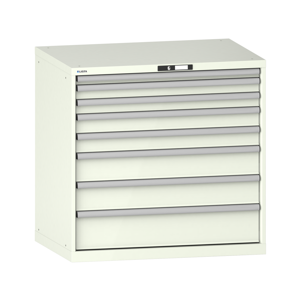 Schubladenschrank 54x36E (BxTxH) 1023x725x1000mm 8 Schubladen (1x50*/2x75/2x100/2x150/1x200) *75/200kg KEY Lock Grauweiss RAL 9002