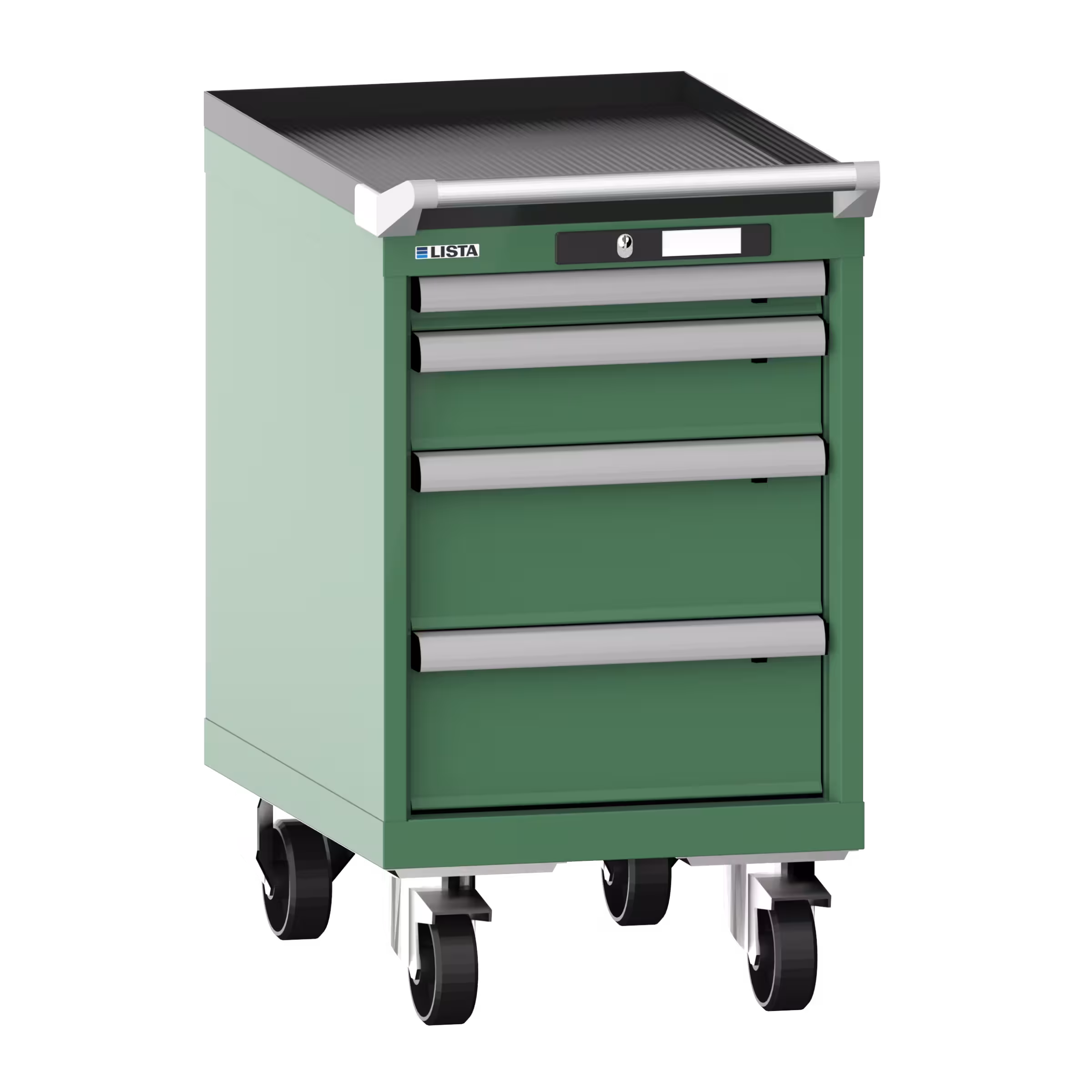 Schubladenschrank mobil 18x27E (BxTxH) 411x572x723mm 4 Schubladen (1x50/1x100/2x150) 75kg Nylonrollen Ø100mm AUTO Lock Resedagrün RAL 6011