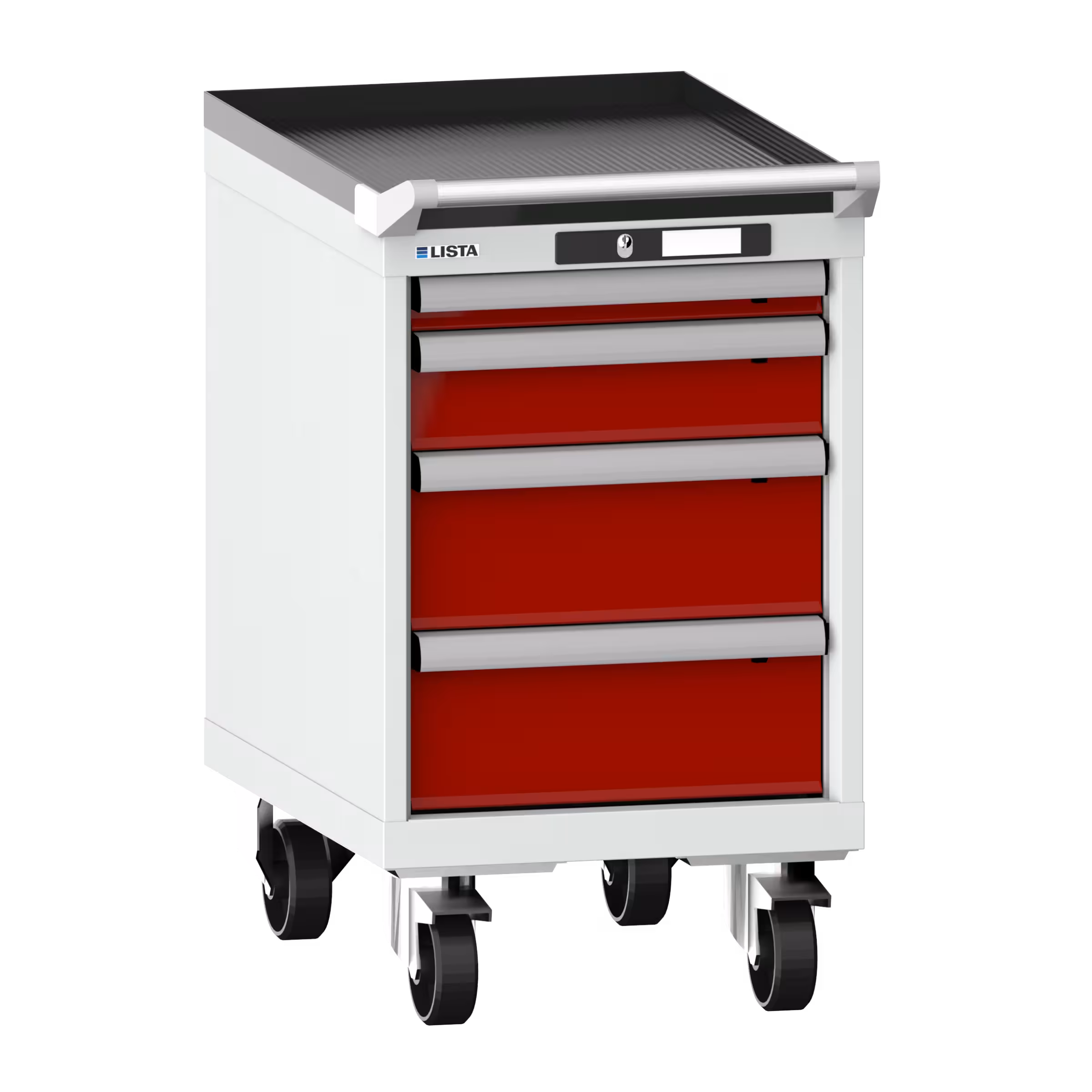 Schubladenschrank mobil 18x27E (BxTxH) 411x572x723mm 4 Schubladen (1x50/1x100/2x150) 75kg Nylonrollen Ø100mm RFID Lock Lichtgrau RAL 7035 / Rubinrot RAL 3003