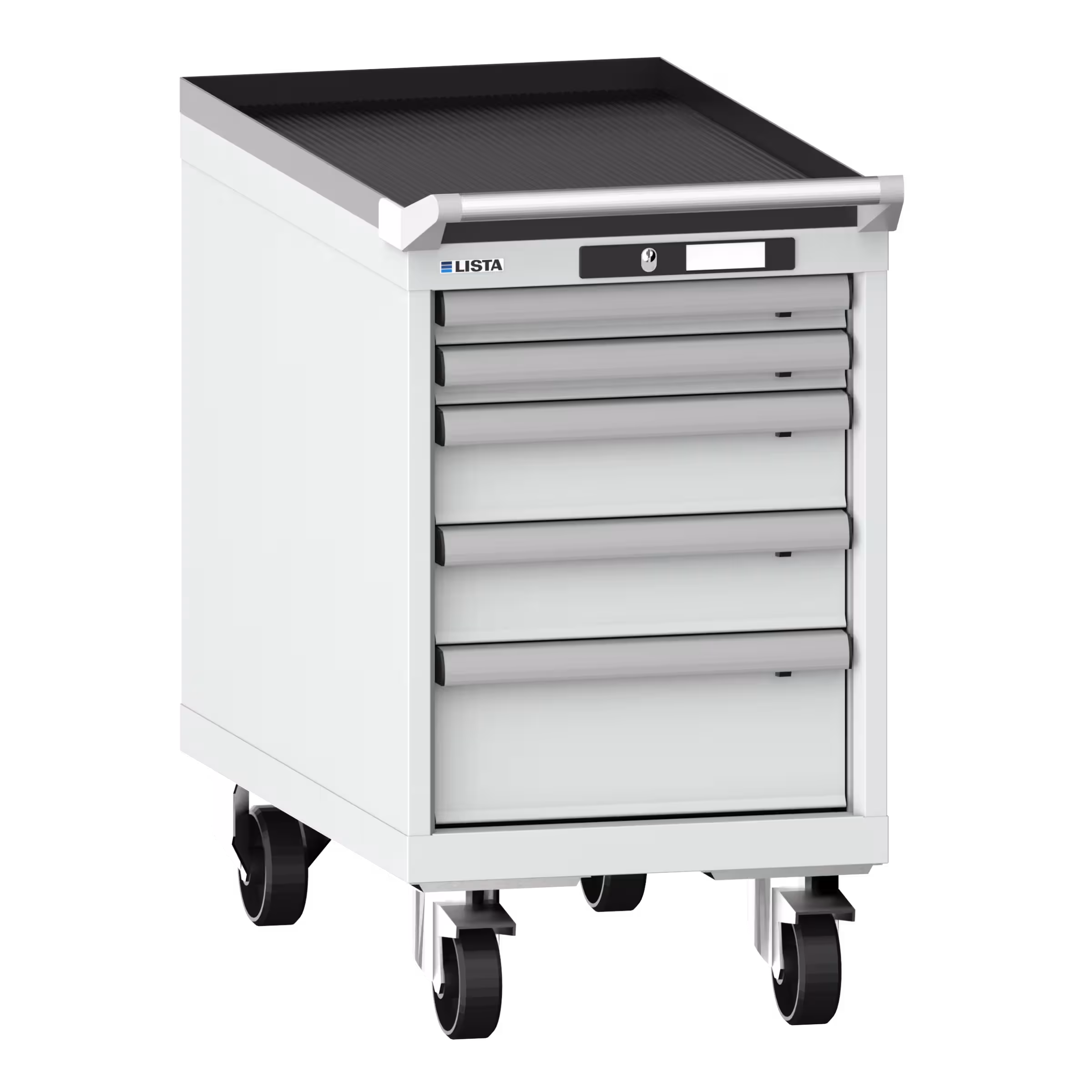 Schubladenschrank mobil 18x36E (BxTxH) 411x725x723mm 5 Schubladen (2x50/2x100/1x150) 75kg Nylonrollen Ø100mm KEY Lock Lichtgrau RAL 7035