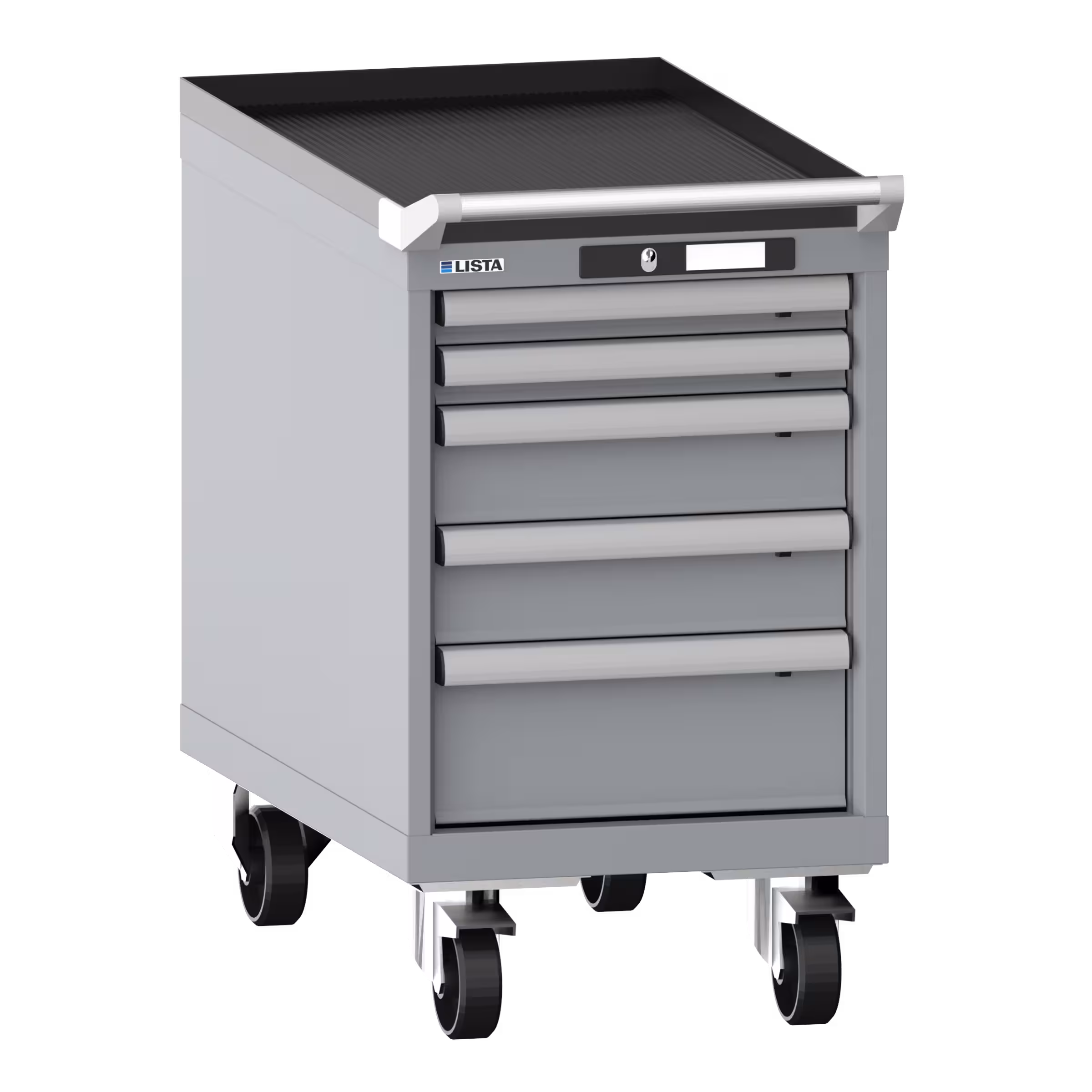 Schubladenschrank mobil 18x36E (BxTxH) 411x725x723mm 5 Schubladen (2x50/2x100/1x150) 75kg Nylonrollen Ø100mm KEY Lock Taubengrau NCS S 4502-B