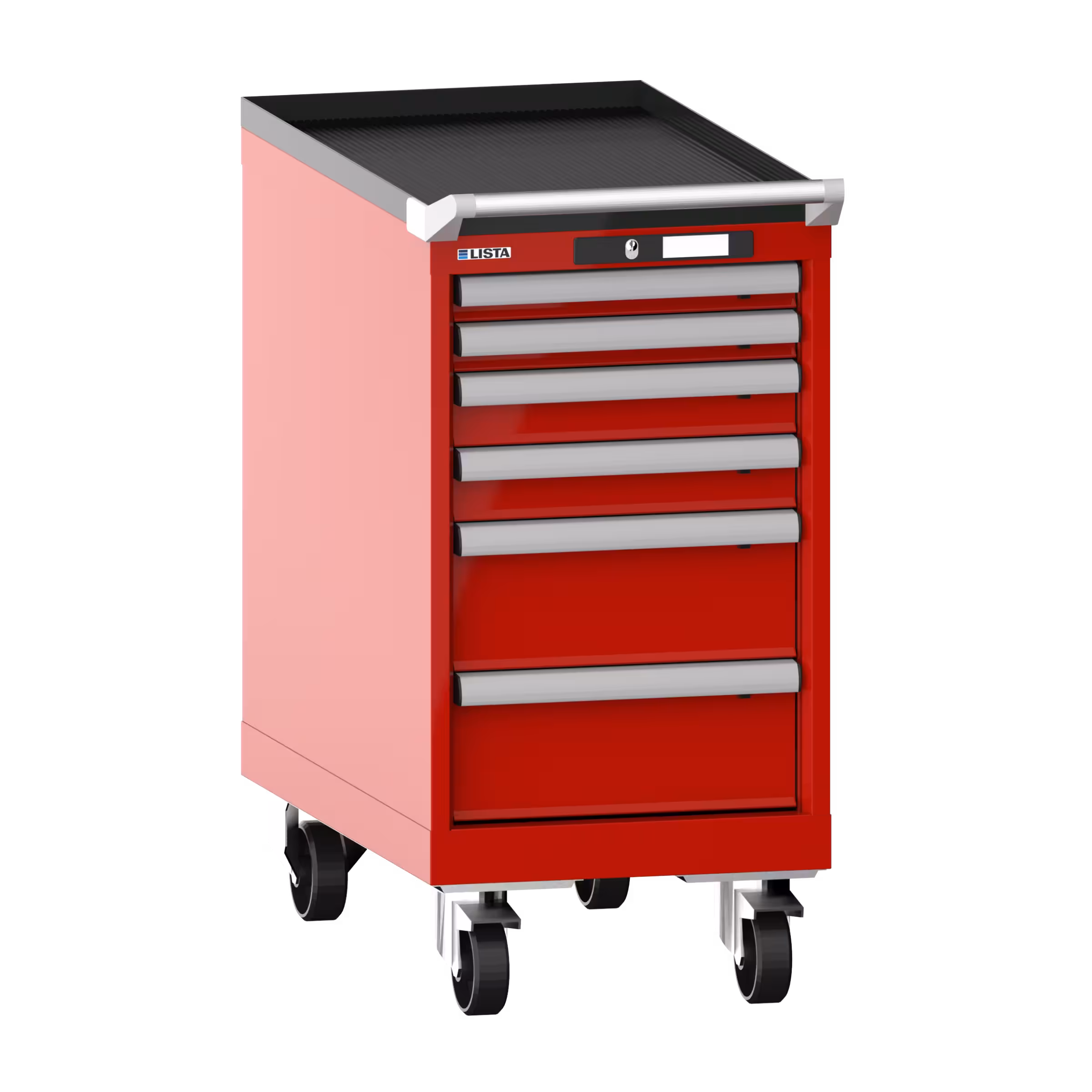 Schubladenschrank mobil 18x36E (BxTxH) 411x725x840mm 6 Schubladen (2x50/2x75/2x150) 75kg Nylonrollen Ø100mm CODE Lock Feuerrot RAL 3000