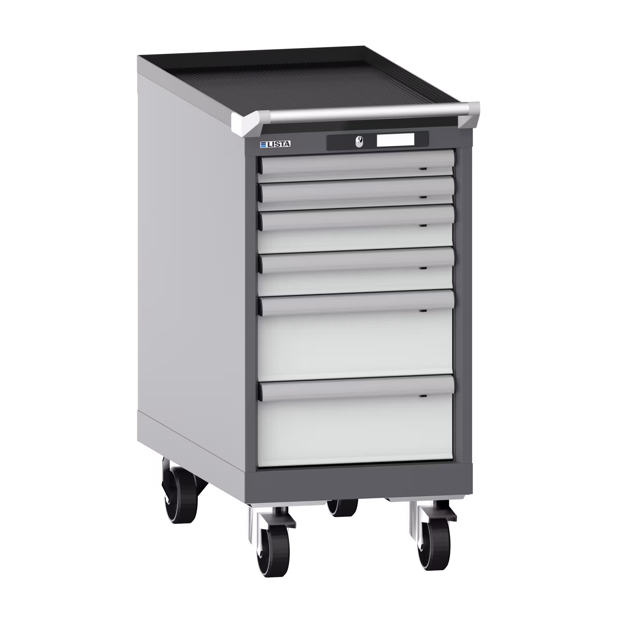 Schubladenschrank mobil 18x36E (BxTxH) 411x725x840mm 6 Schubladen (2x50/2x75/2x150) 75kg Nylonrollen Ø100mm CODE Lock Grau metallic NCS S 6502-B / Lichtgrau RAL 7035