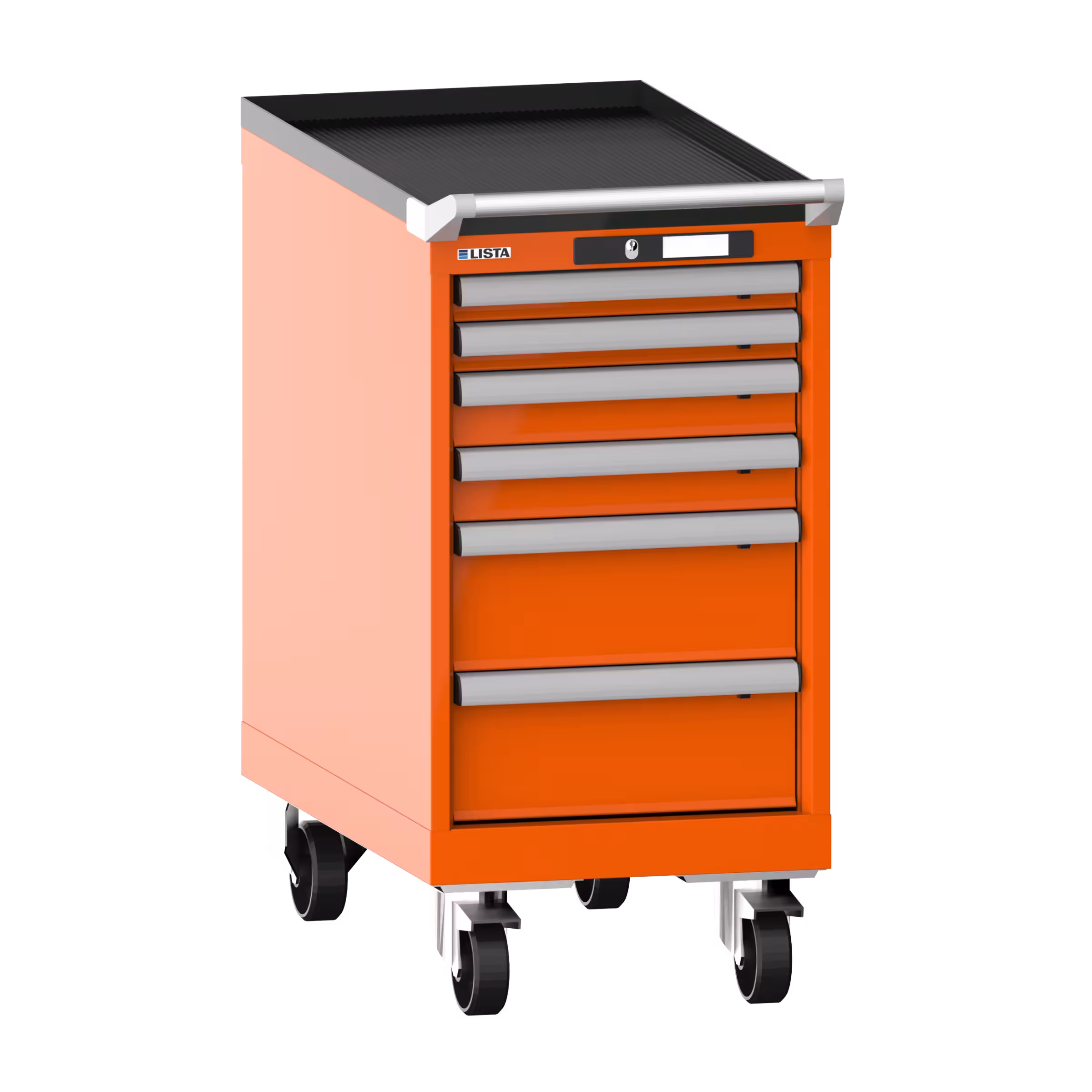 Schubladenschrank mobil 18x36E (BxTxH) 411x725x840mm 6 Schubladen (2x50/2x75/2x150) 75kg Nylonrollen Ø100mm CODE Lock Orange RAL 2004
