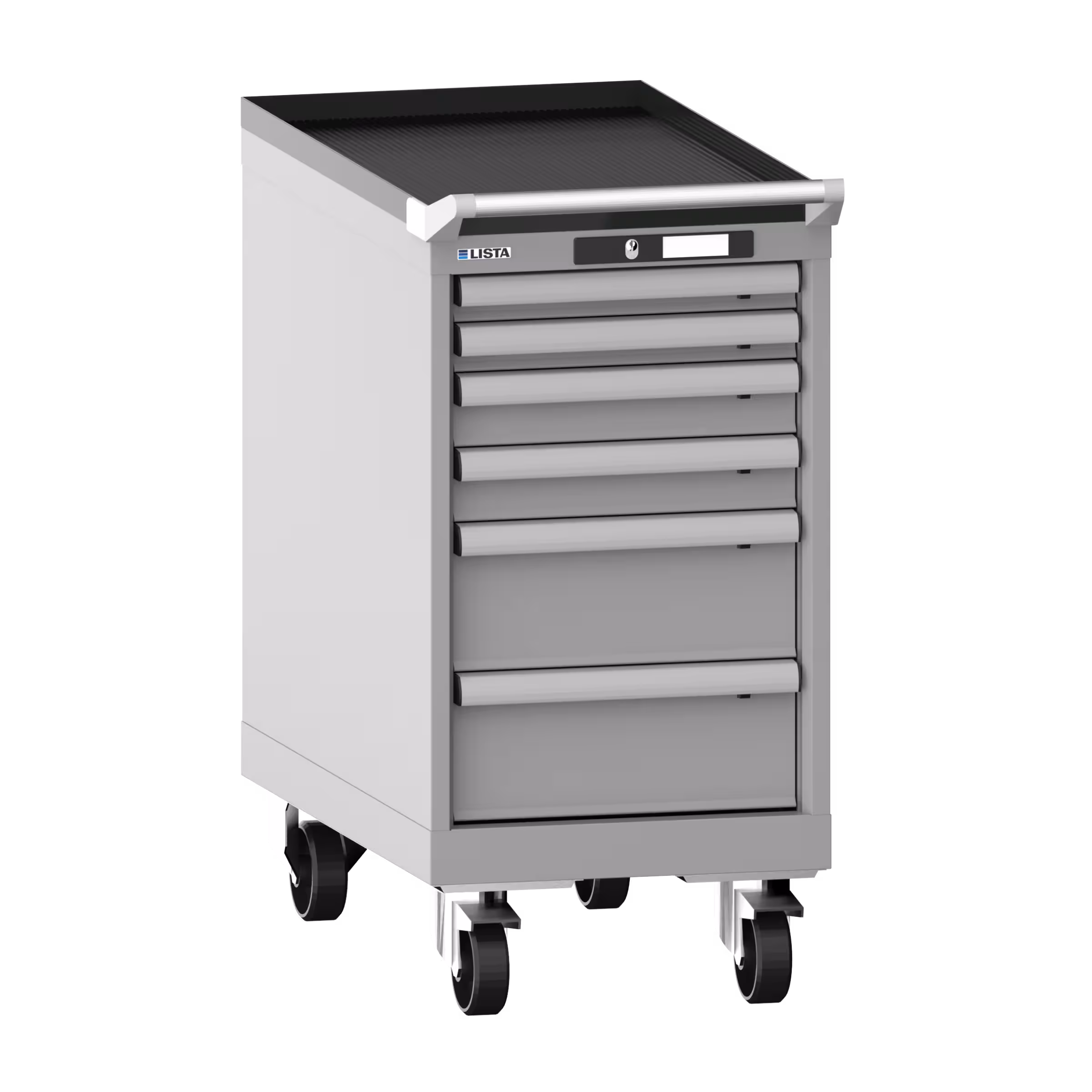 Schubladenschrank mobil 18x36E (BxTxH) 411x725x840mm 6 Schubladen (2x50/2x75/2x150) 75kg Nylonrollen Ø100mm CODE Lock Weissaluminium RAL 9006
