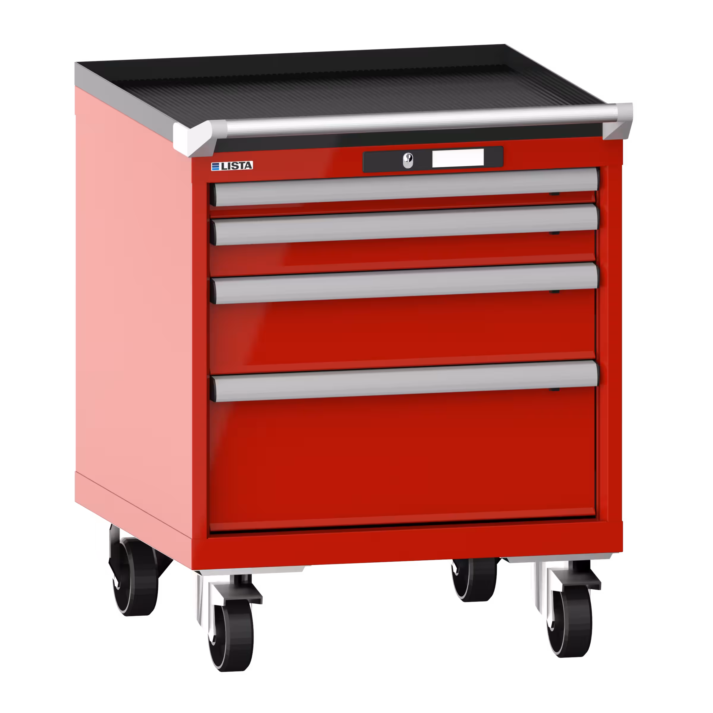 Schubladenschrank mobil 27x27E (BxTxH) 564x572x723mm 4 Schubladen (1x50/1x75/1x125/1x200) 75kg Nylonrollen Ø100mm CODE Lock Feuerrot RAL 3000