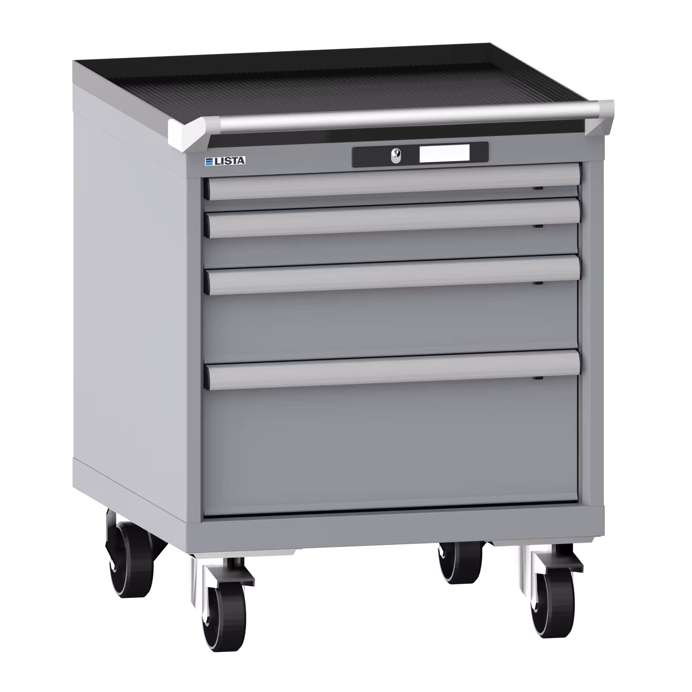 Schubladenschrank mobil 27x27E (BxTxH) 564x572x723mm 4 Schubladen (1x50/1x75/1x125/1x200) 75kg Nylonrollen Ø100mm CODE Lock Taubengrau NCS S 4502-B