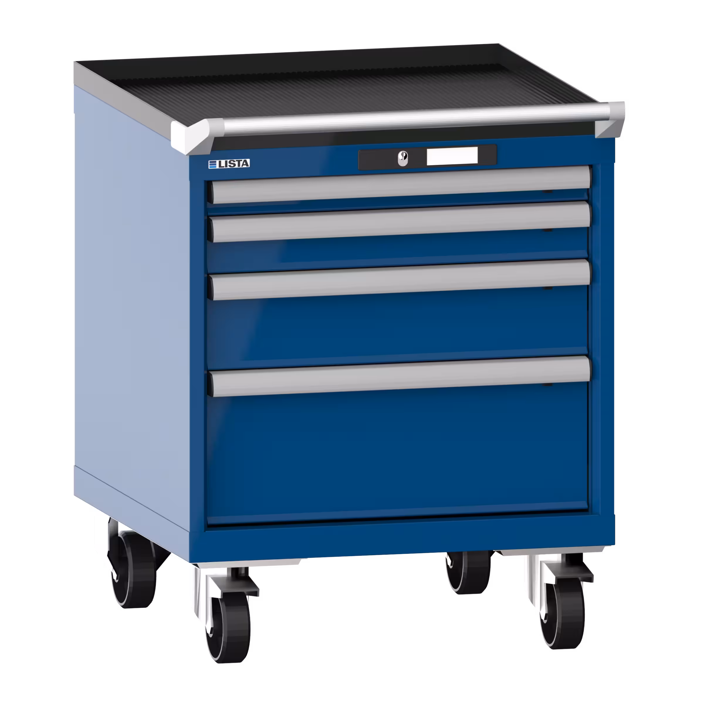 Schubladenschrank mobil 27x27E (BxTxH) 564x572x723mm 4 Schubladen (1x50/1x75/1x125/1x200) 75kg Nylonrollen Ø100mm KEY Lock Enzianblau RAL 5010