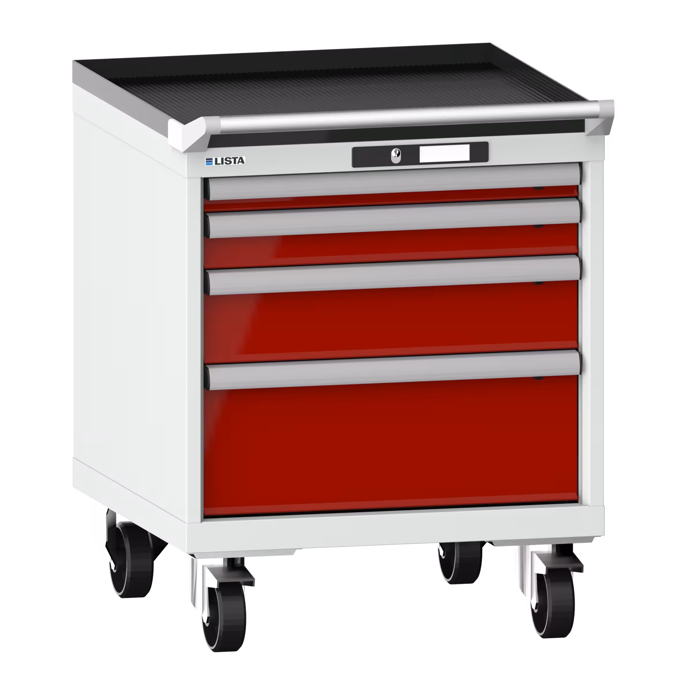 Schubladenschrank mobil 27x27E (BxTxH) 564x572x723mm 4 Schubladen (1x50/1x75/1x125/1x200) 75kg Nylonrollen Ø100mm KEY Lock Lichtgrau RAL 7035 / Rubinrot RAL 3003