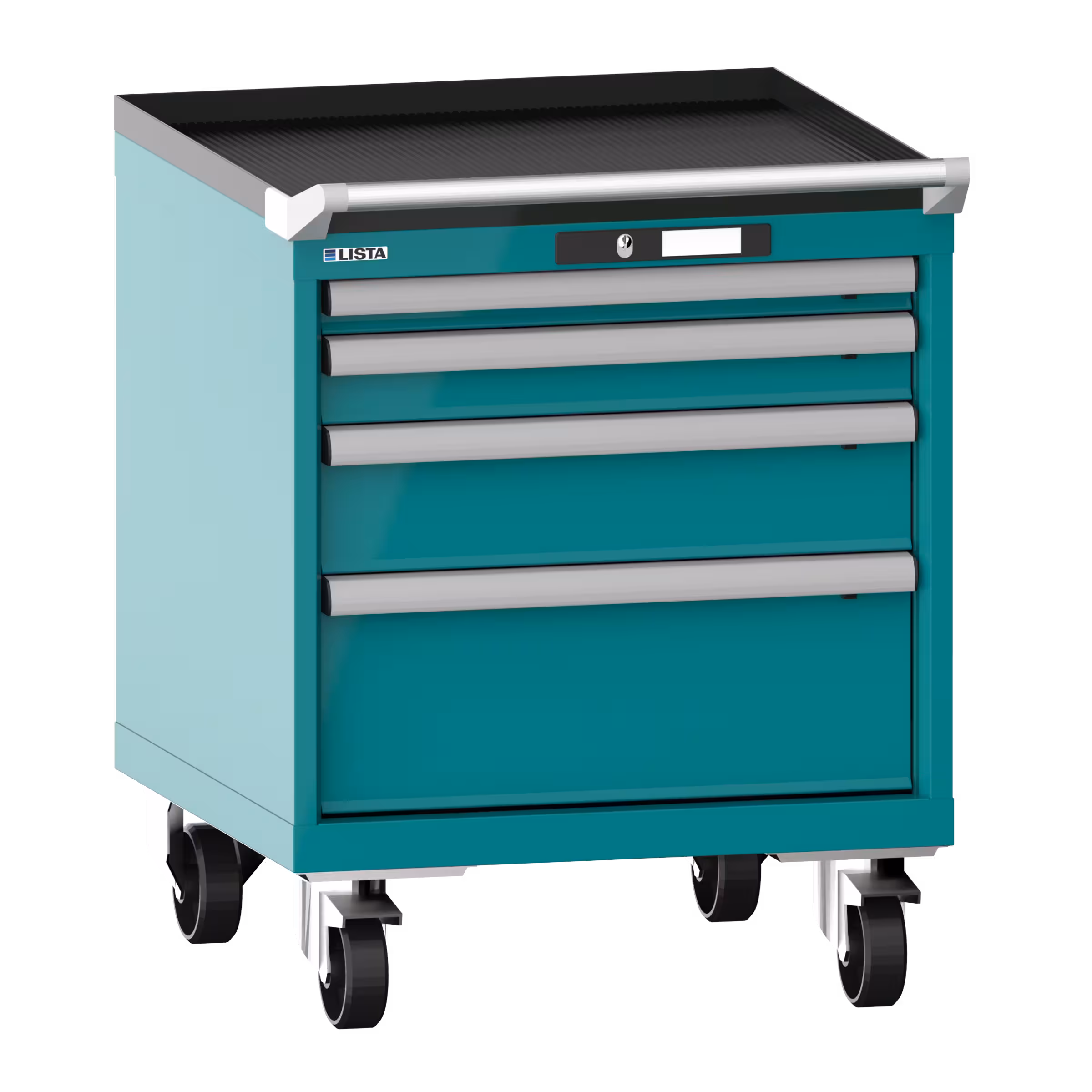 Schubladenschrank mobil 27x27E (BxTxH) 564x572x723mm 4 Schubladen (1x50/1x75/1x125/1x200) 75kg Nylonrollen Ø100mm KEY Lock Türkisblau RAL 5018