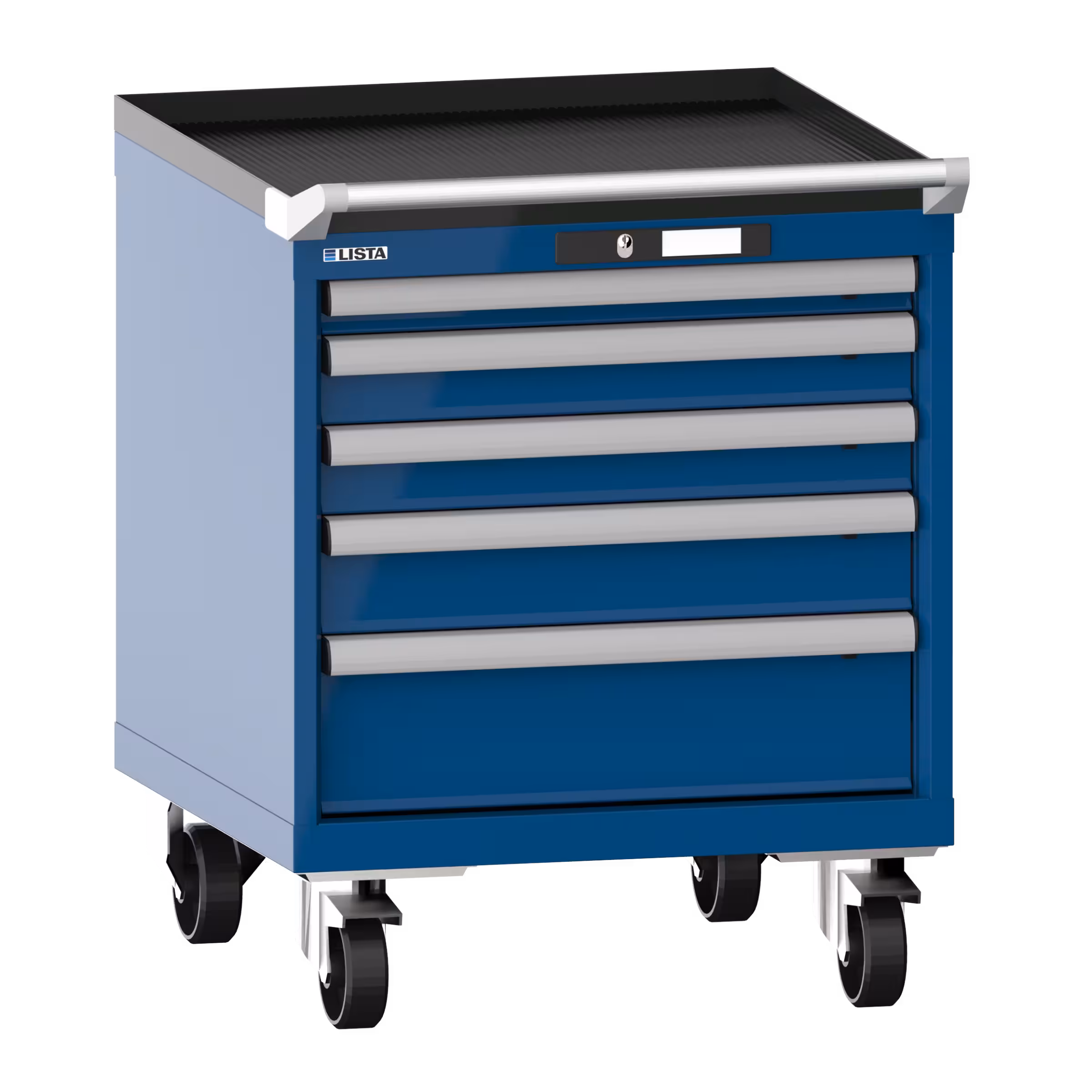 Schubladenschrank mobil 27x27E (BxTxH) 564x572x723mm 5 Schubladen (1x50/2x75/1x100/1x150) 75kg Nylonrollen Ø100mm AUTO Lock Enzianblau RAL 5010