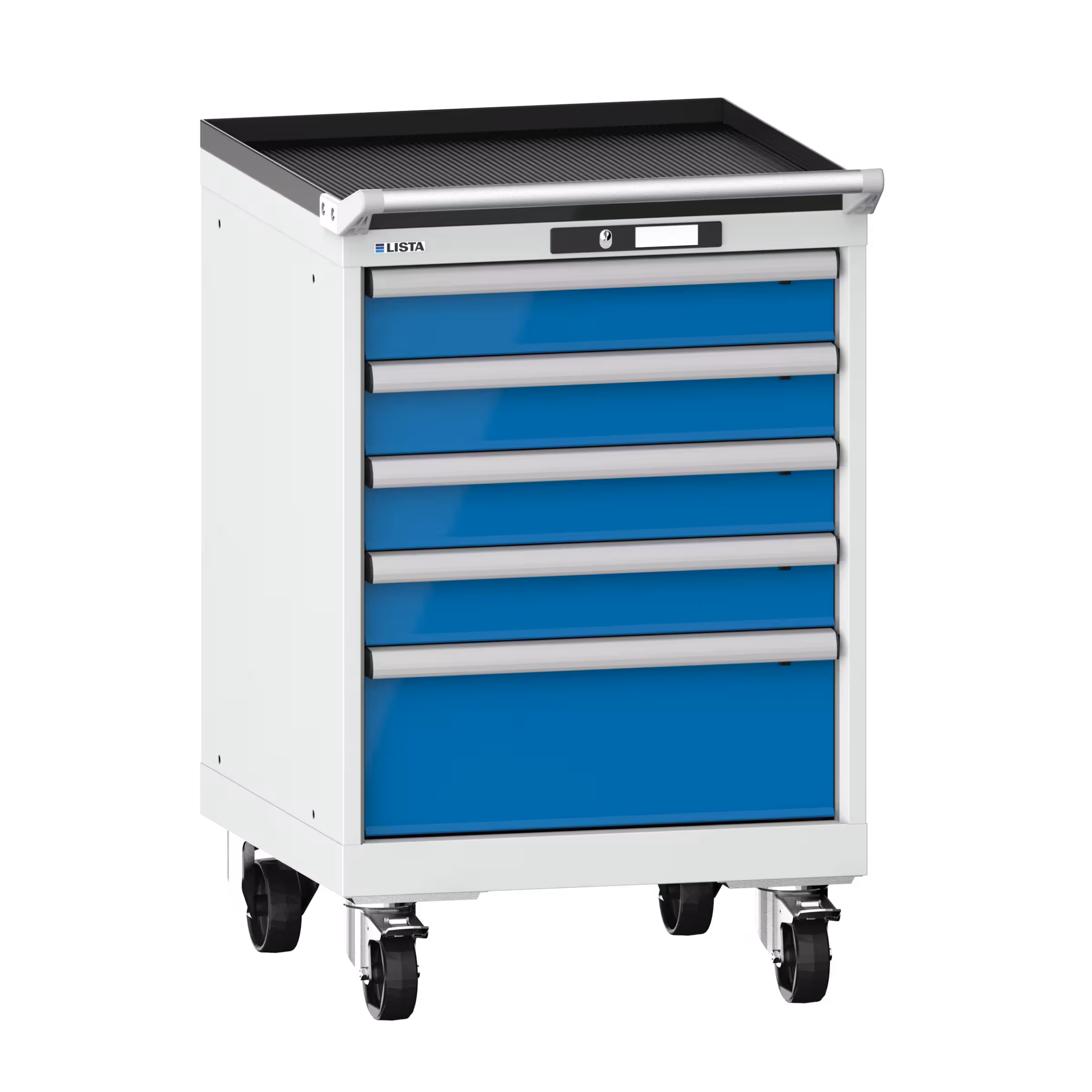Schubladenschrank mobil 27x27E (BxTxH) 564x572x890mm 5 Schubladen (4x100/1x200) 75kg Nylonrollen Ø100mm AUTO Lock Lichtgrau RAL 7035 / Lichtblau RAL 5012