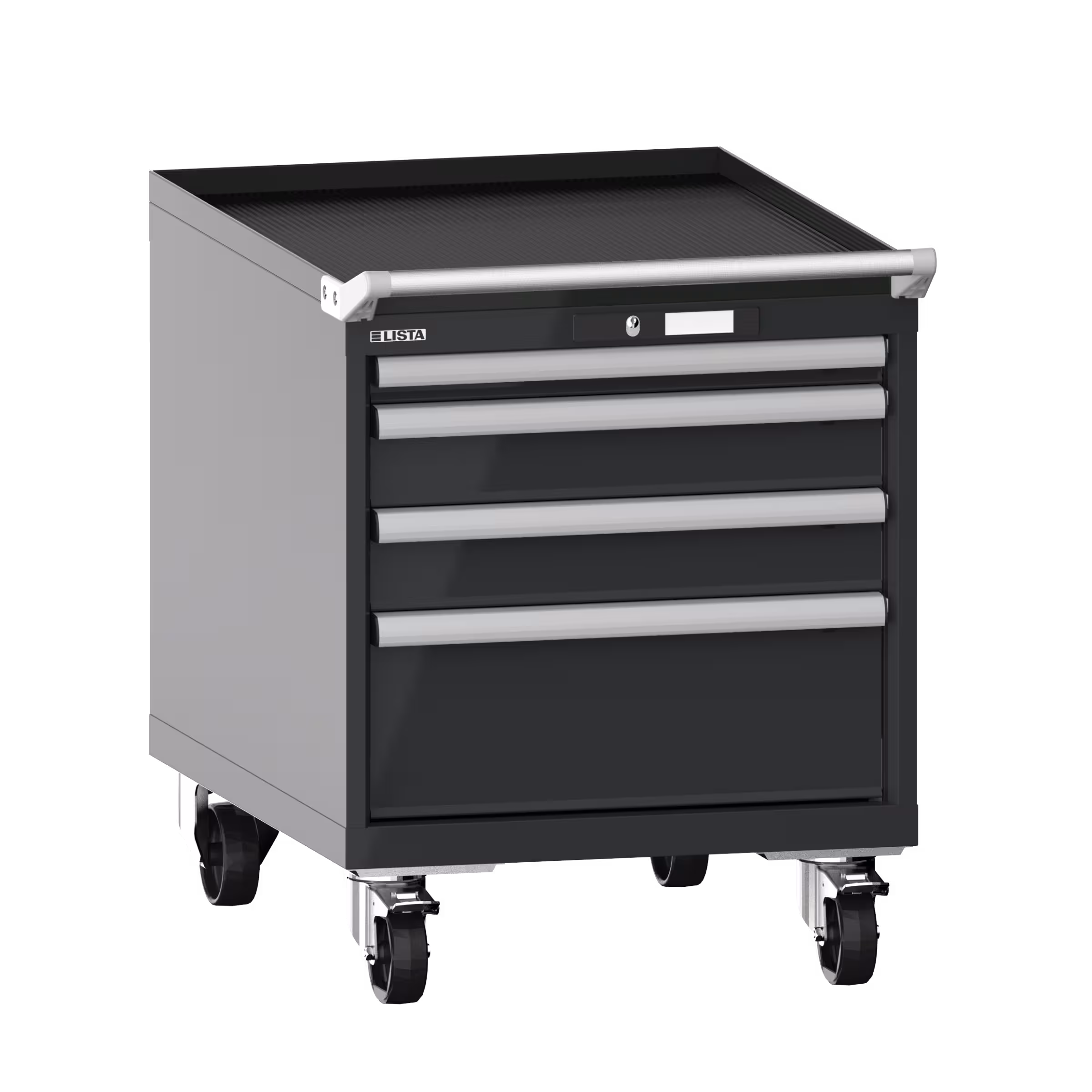 Schubladenschrank mobil 27x36E (BxTxH) 564x725x723mm 4 Schubladen (1x50/2x100/1x200) 75kg Nylonrollen Ø100mm KEY Lock Anthrazitgrau RAL 7016