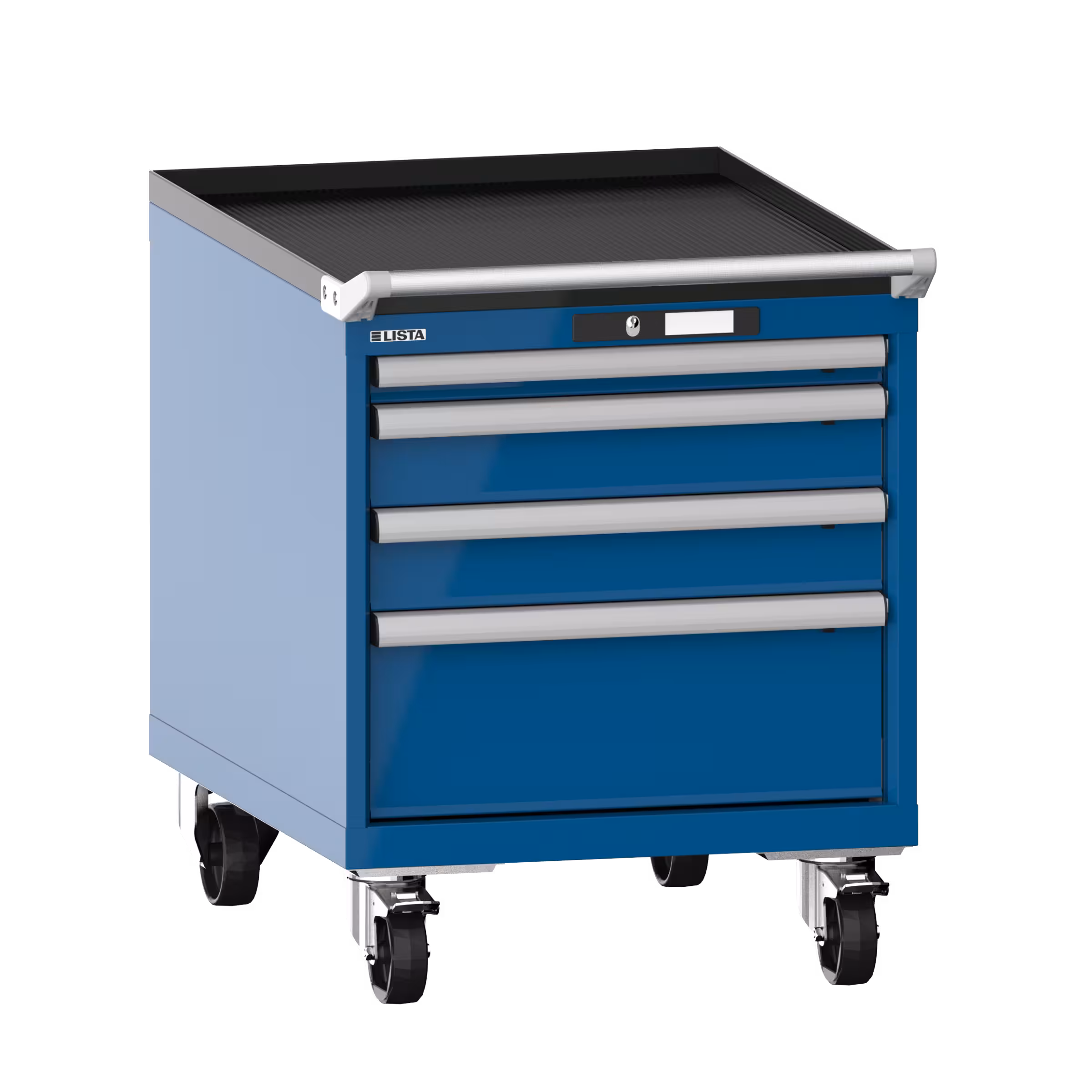 Schubladenschrank mobil 27x36E (BxTxH) 564x725x723mm 4 Schubladen (1x50/2x100/1x200) 75kg Nylonrollen Ø100mm KEY Lock Capriblau RAL 5019
