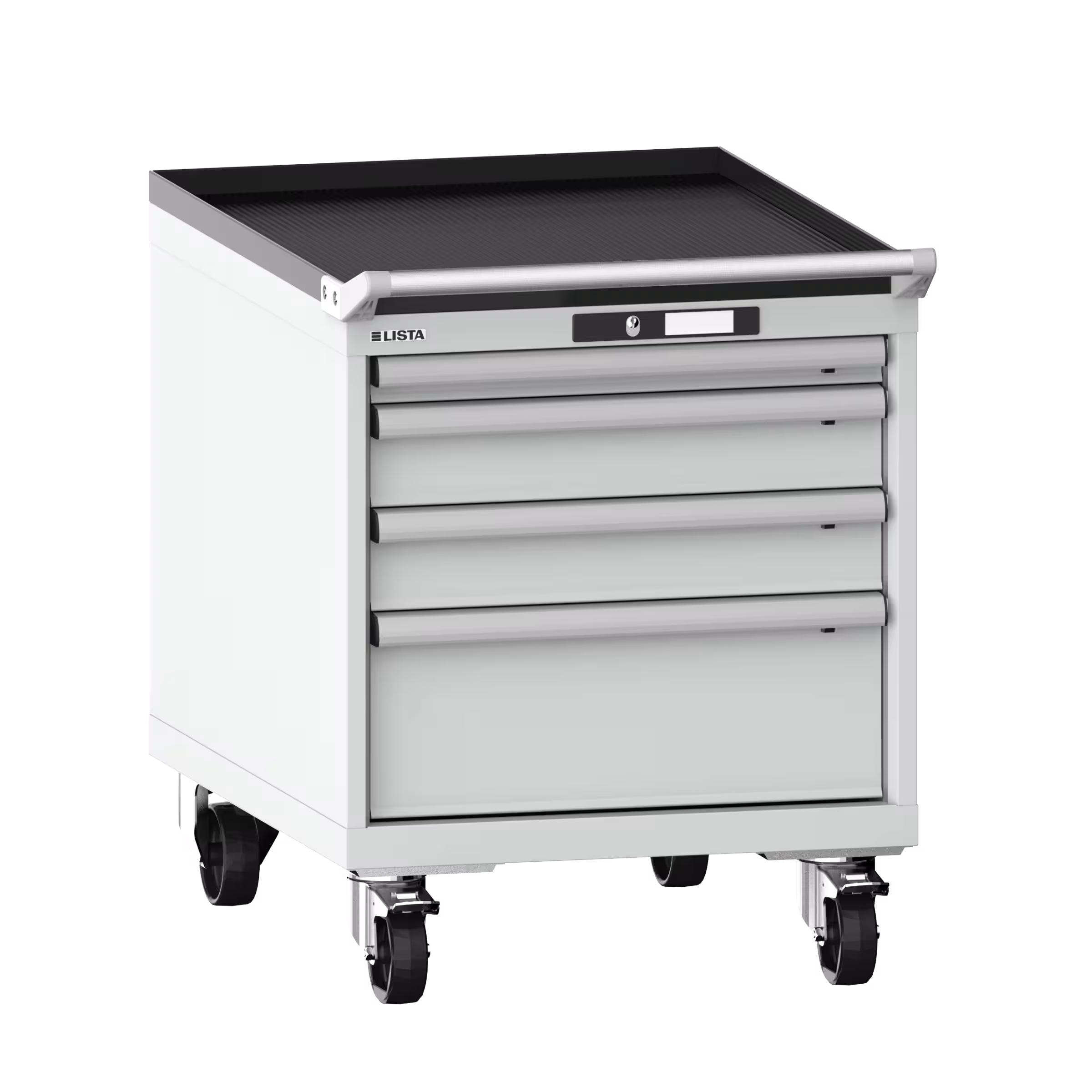 Schubladenschrank mobil 27x36E (BxTxH) 564x725x723mm 4 Schubladen (1x50/2x100/1x200) 75kg Nylonrollen Ø100mm KEY Lock Hellgrau NCS S 2000-N