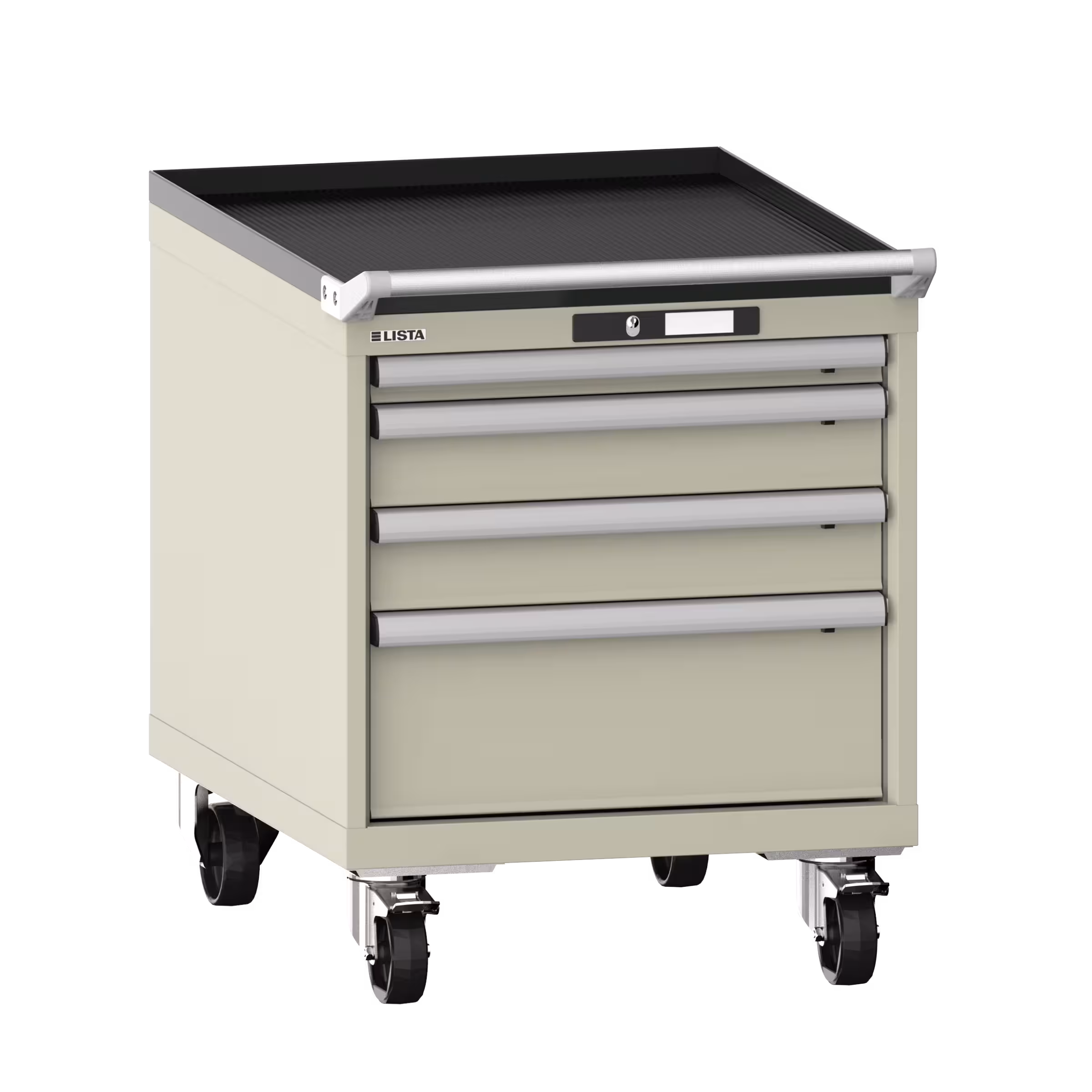 Schubladenschrank mobil 27x36E (BxTxH) 564x725x723mm 4 Schubladen (1x50/2x100/1x200) 75kg Nylonrollen Ø100mm KEY Lock Kieselgrau RAL 7032