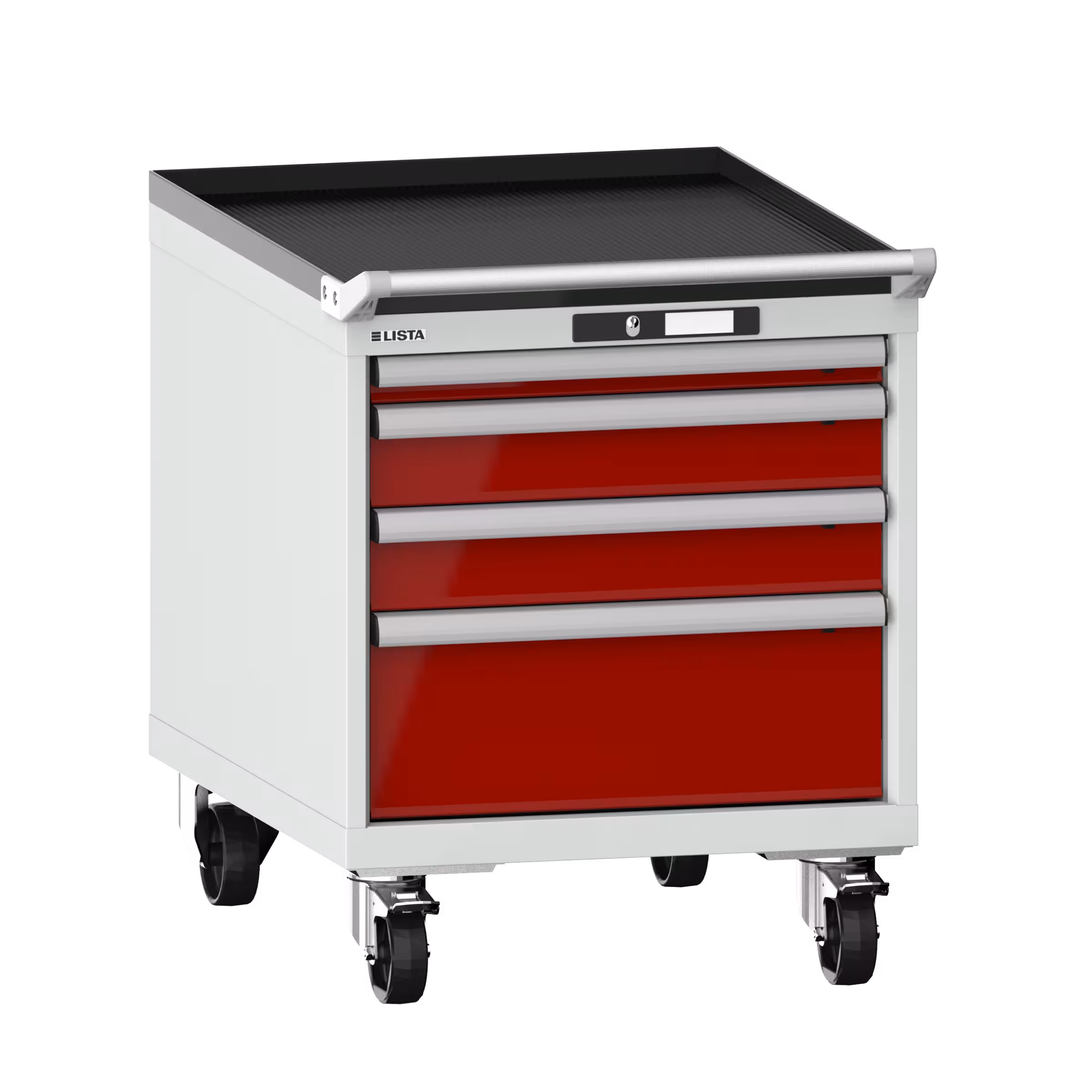 Schubladenschrank mobil 27x36E (BxTxH) 564x725x723mm 4 Schubladen (1x50/2x100/1x200) 75kg Nylonrollen Ø100mm KEY Lock Lichtgrau RAL 7035 / Rubinrot RAL 3003