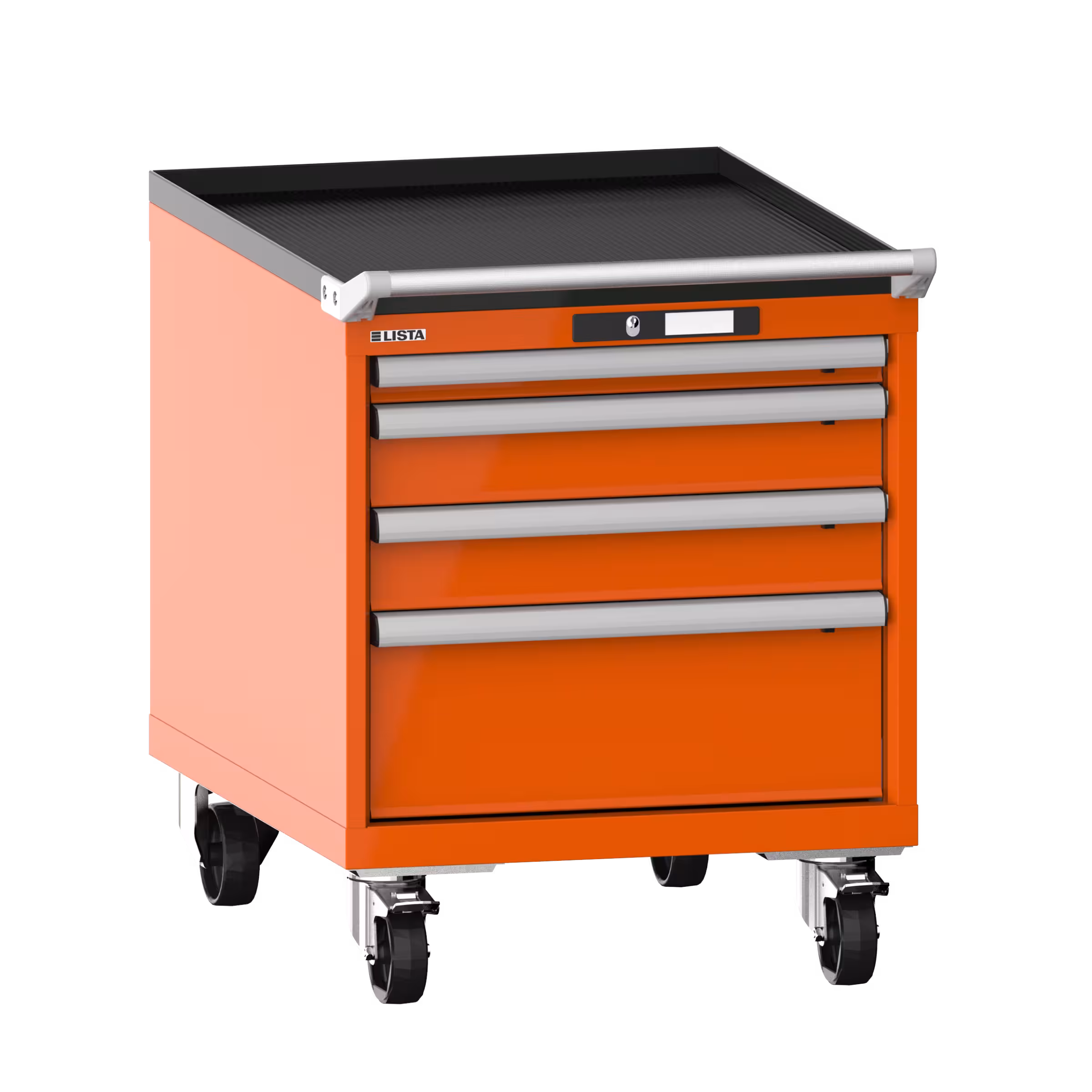 Schubladenschrank mobil 27x36E (BxTxH) 564x725x723mm 4 Schubladen (1x50/2x100/1x200) 75kg Nylonrollen Ø100mm KEY Lock Orange RAL 2004