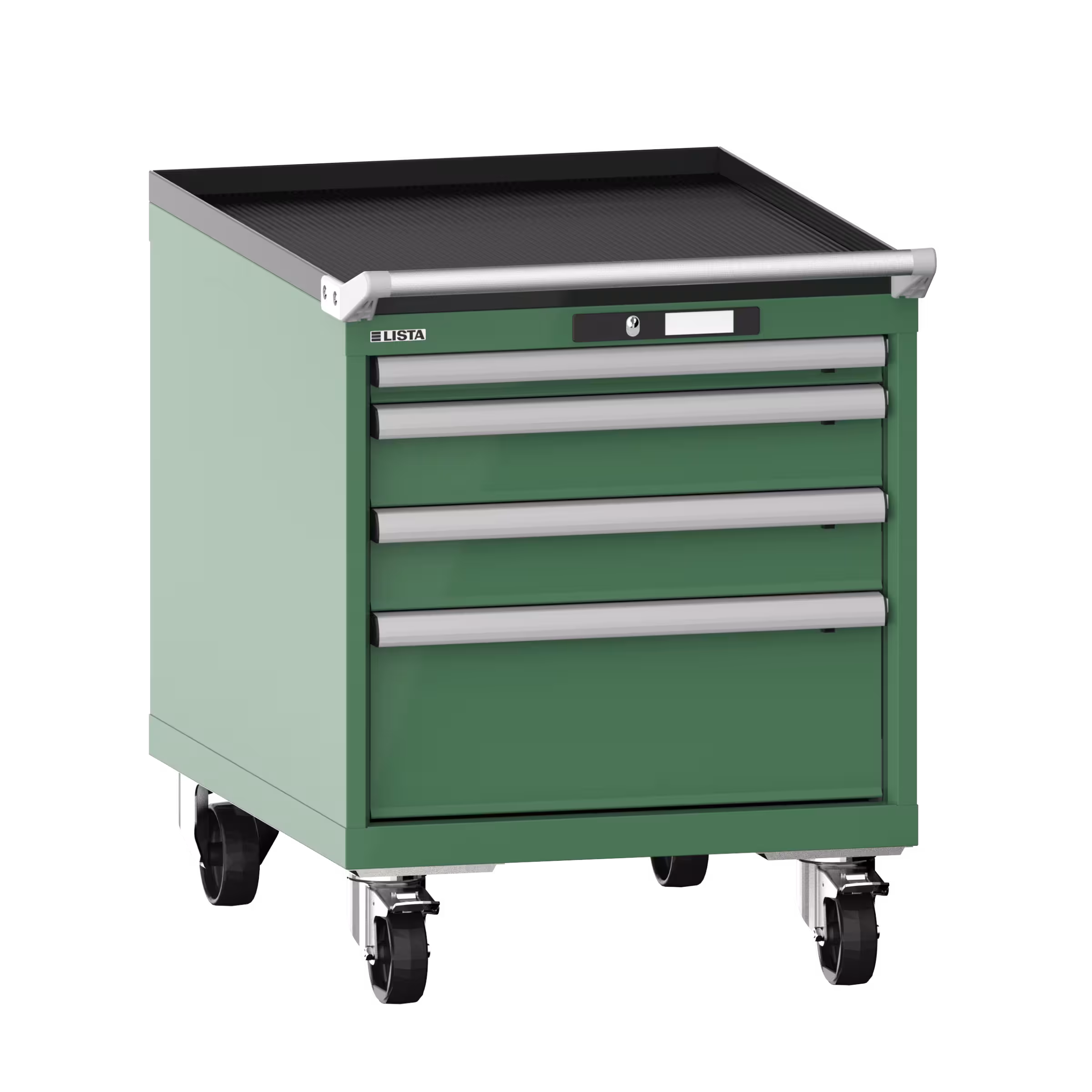 Schubladenschrank mobil 27x36E (BxTxH) 564x725x723mm 4 Schubladen (1x50/2x100/1x200) 75kg Nylonrollen Ø100mm KEY Lock Resedagrün RAL 6011