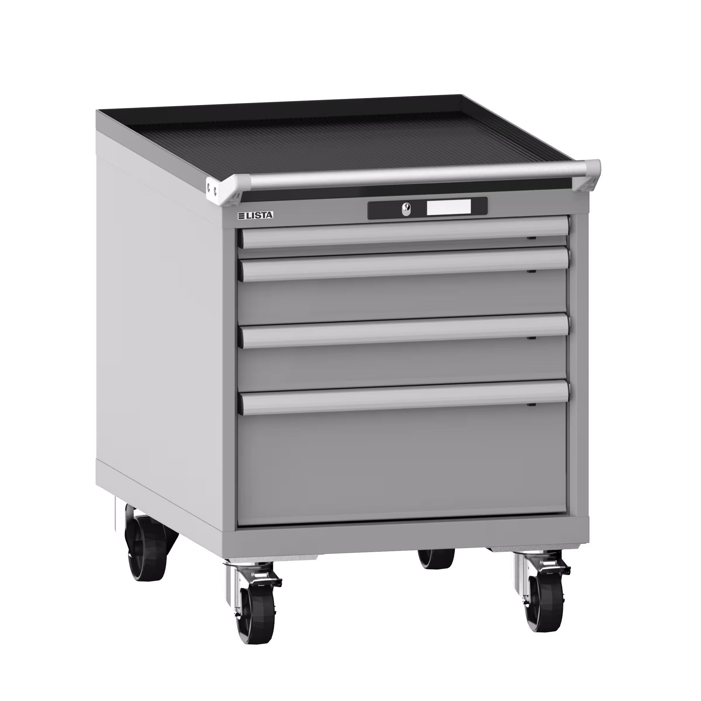 Schubladenschrank mobil 27x36E (BxTxH) 564x725x723mm 4 Schubladen (1x50/2x100/1x200) 75kg Nylonrollen Ø100mm KEY Lock Weissaluminium RAL 9006