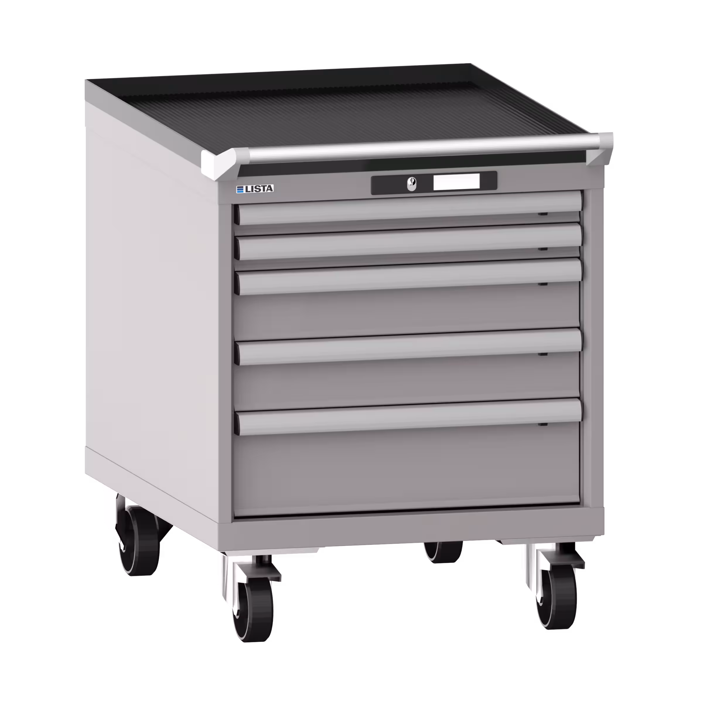 Schubladenschrank mobil 27x36E (BxTxH) 564x725x723mm 5 Schubladen (2x50/2x100/1x150) 75kg Nylonrollen Ø100mm KEY Lock Graualuminium RAL 9007