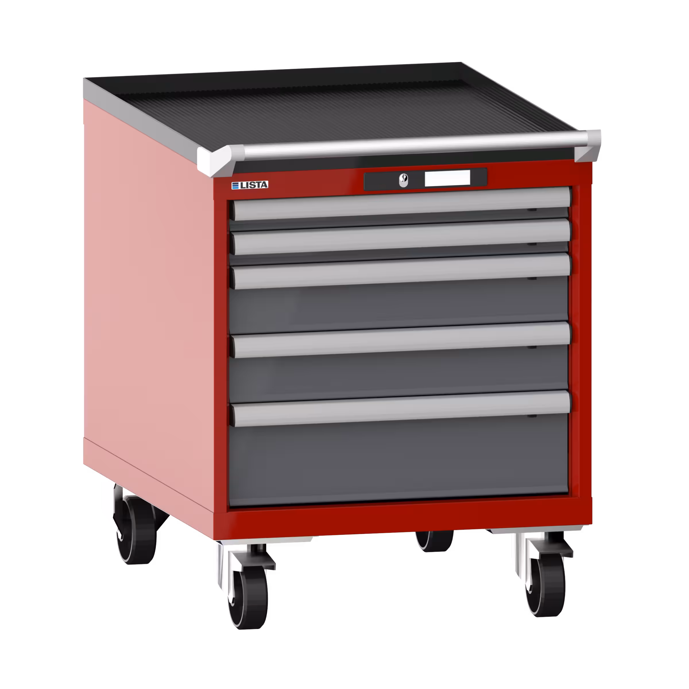 Schubladenschrank mobil 27x36E (BxTxH) 564x725x723mm 5 Schubladen (2x50/2x100/1x150) 75kg Nylonrollen Ø100mm KEY Lock Rubinrot RAL 3003 / Grau metallic NCS S 6502-B