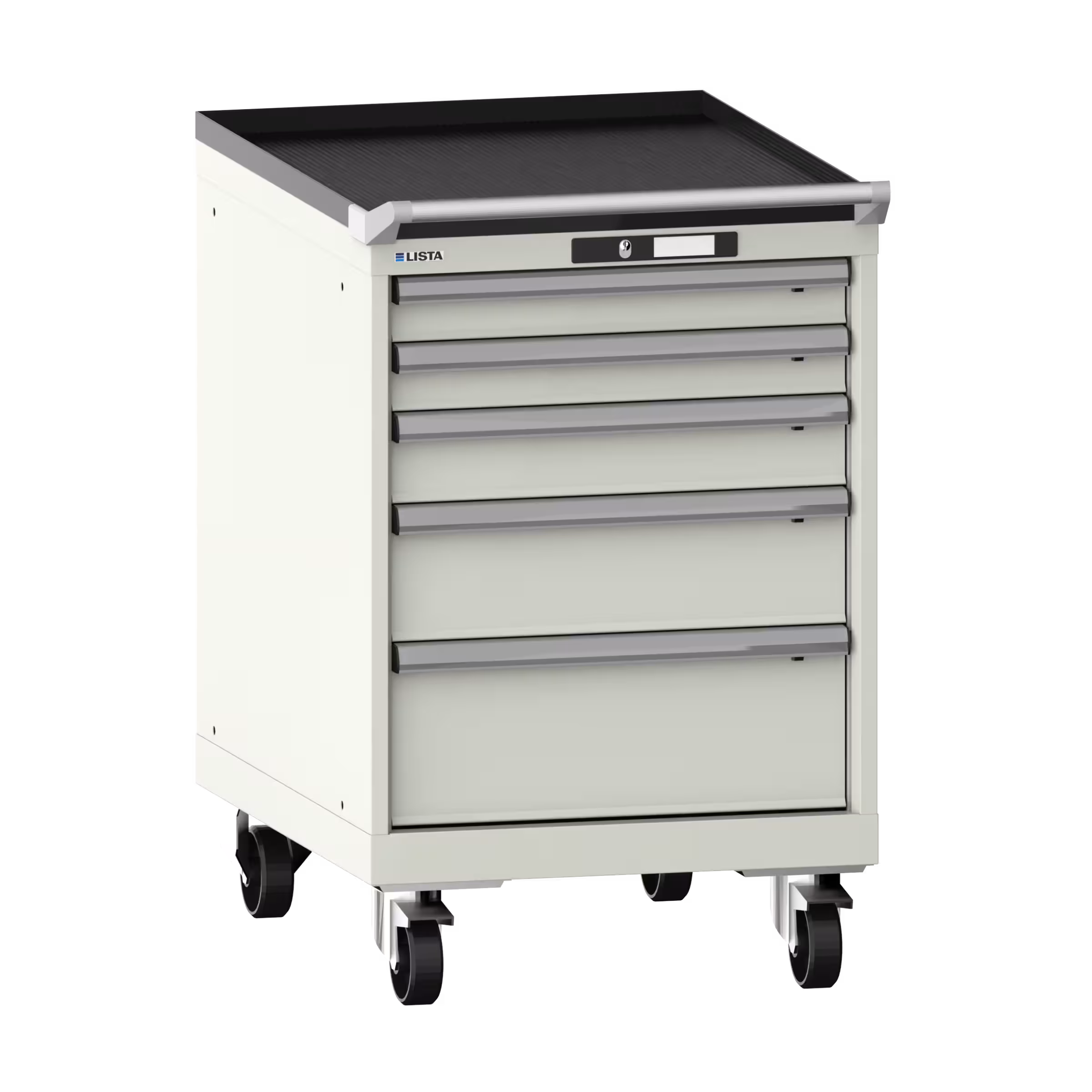 Schubladenschrank mobil 27x36E (BxTxH) 564x725x890mm 5 Schubladen (2x75/1x100/1x150/1x200) 75kg Nylonrollen Ø100mm AUTO Lock Grauweiss RAL 9002