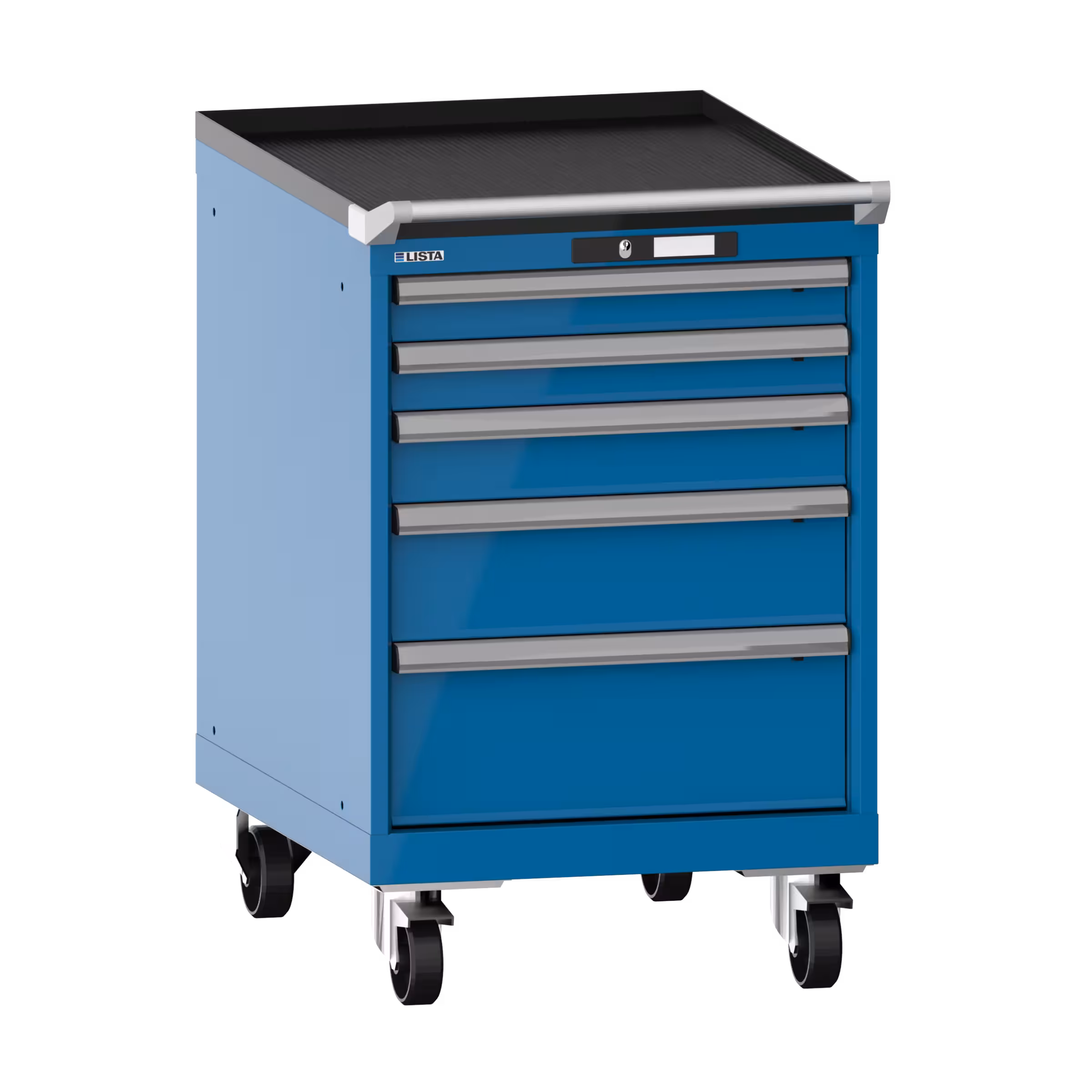 Schubladenschrank mobil 27x36E (BxTxH) 564x725x890mm 5 Schubladen (2x75/1x100/1x150/1x200) 75kg Nylonrollen Ø100mm AUTO Lock Lichtblau RAL 5012