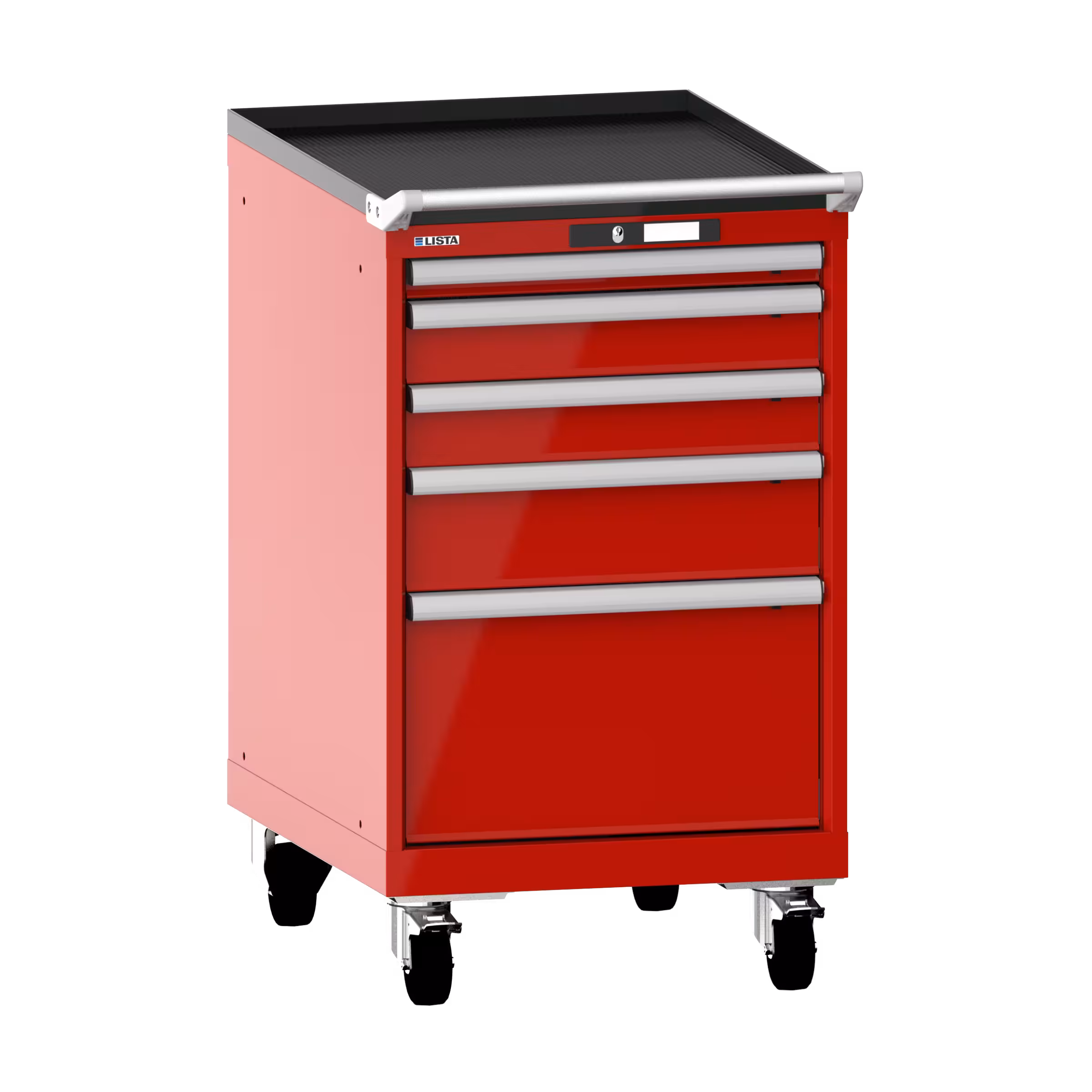 Schubladenschrank mobil 27x36E (BxTxH) 564x725x990mm 5 Schubladen (1x50/2x100/1x150/1x300) 75kg Nylonrollen Ø100mm KEY Lock Feuerrot RAL 3000
