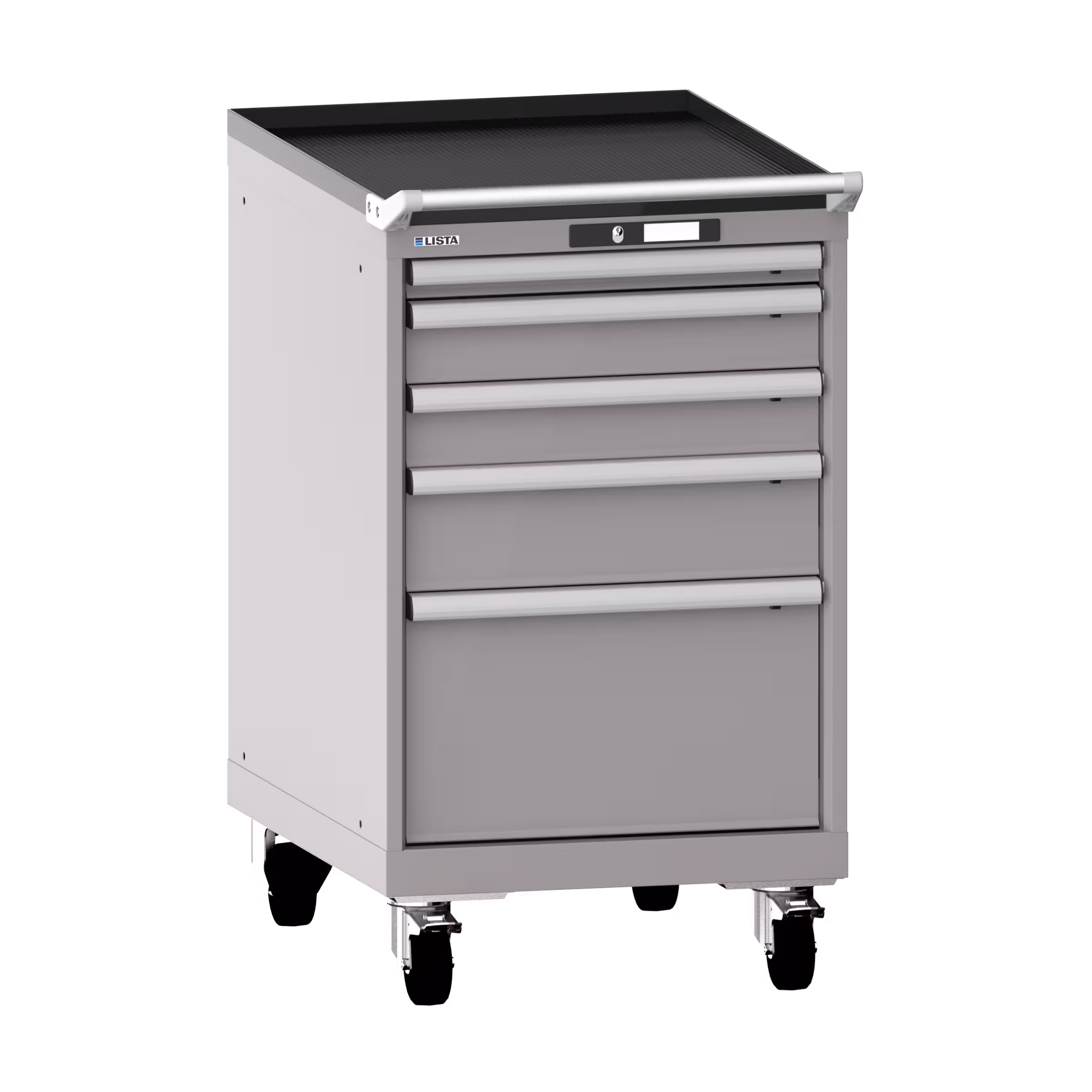 Schubladenschrank mobil 27x36E (BxTxH) 564x725x990mm 5 Schubladen (1x50/2x100/1x150/1x300) 75kg Nylonrollen Ø100mm KEY Lock Graualuminium RAL 9007