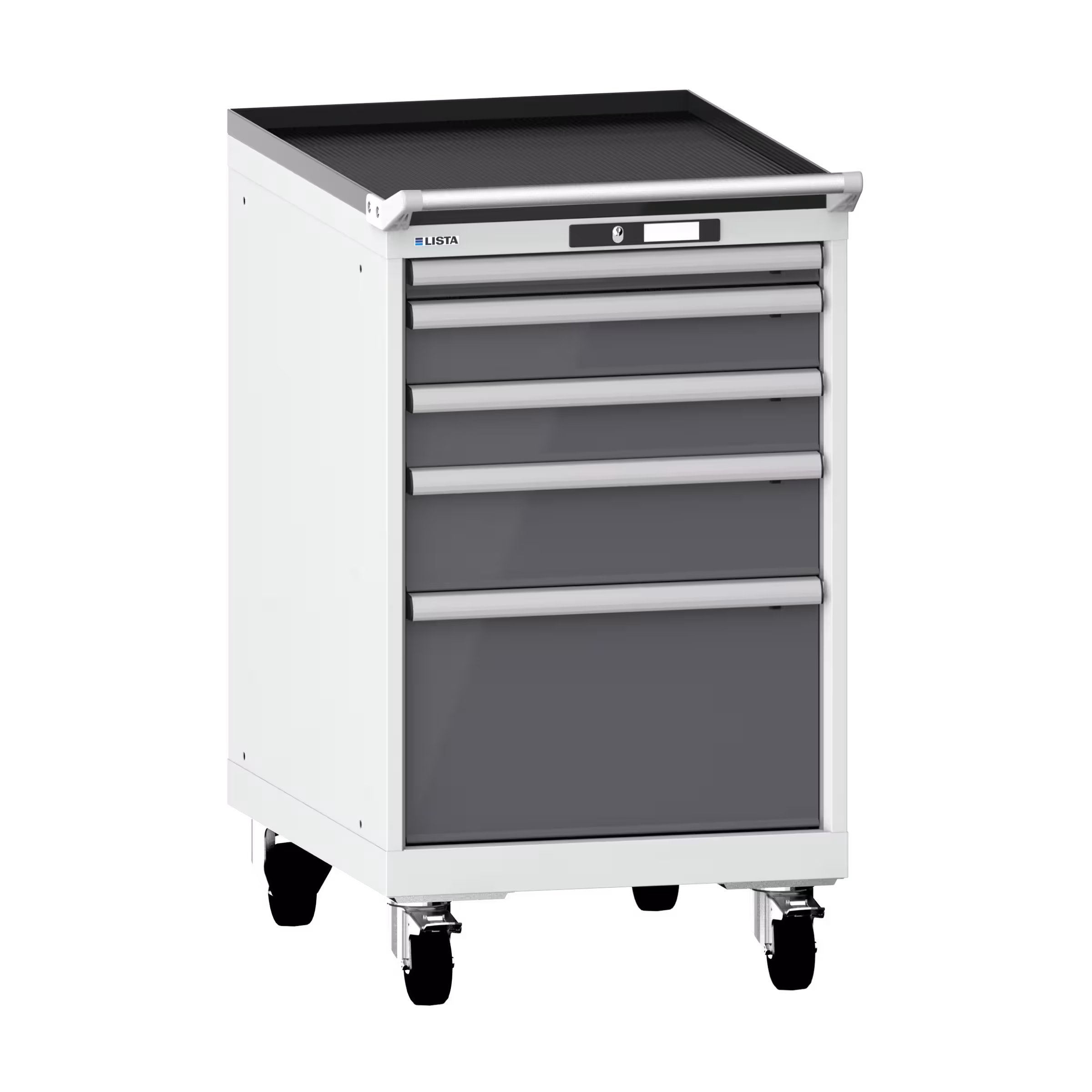 Schubladenschrank mobil 27x36E (BxTxH) 564x725x990mm 5 Schubladen (1x50/2x100/1x150/1x300) 75kg Nylonrollen Ø100mm KEY Lock Lichtgrau RAL 7035 / Grau metallic NCS S 6502-B