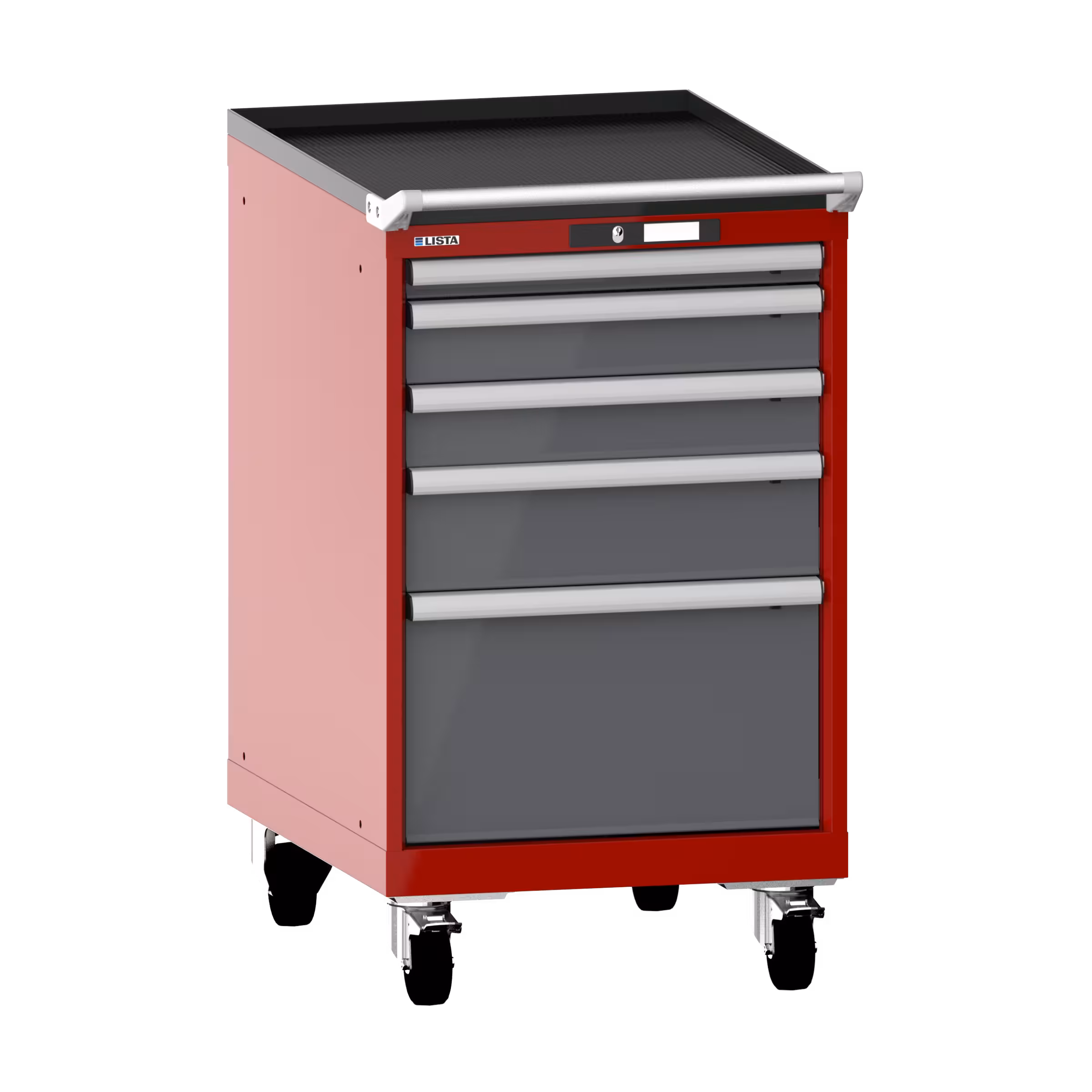 Schubladenschrank mobil 27x36E (BxTxH) 564x725x990mm 5 Schubladen (1x50/2x100/1x150/1x300) 75kg Nylonrollen Ø100mm KEY Lock Rubinrot RAL 3003 / Grau metallic NCS S 6502-B