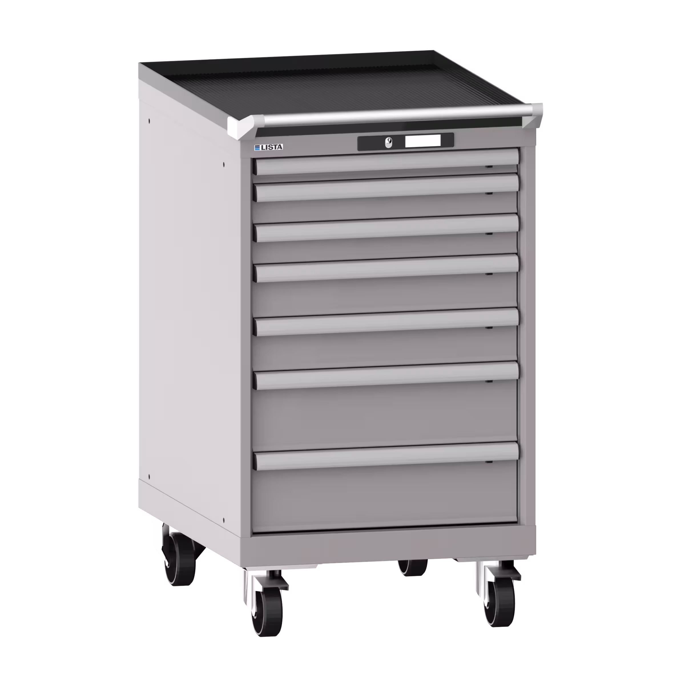 Schubladenschrank mobil 27x36E (BxTxH) 564x725x990mm 7 Schubladen (1x50/2x75/2x100/2x150) 75kg Nylonrollen Ø100mm AUTO Lock Graualuminium RAL 9007