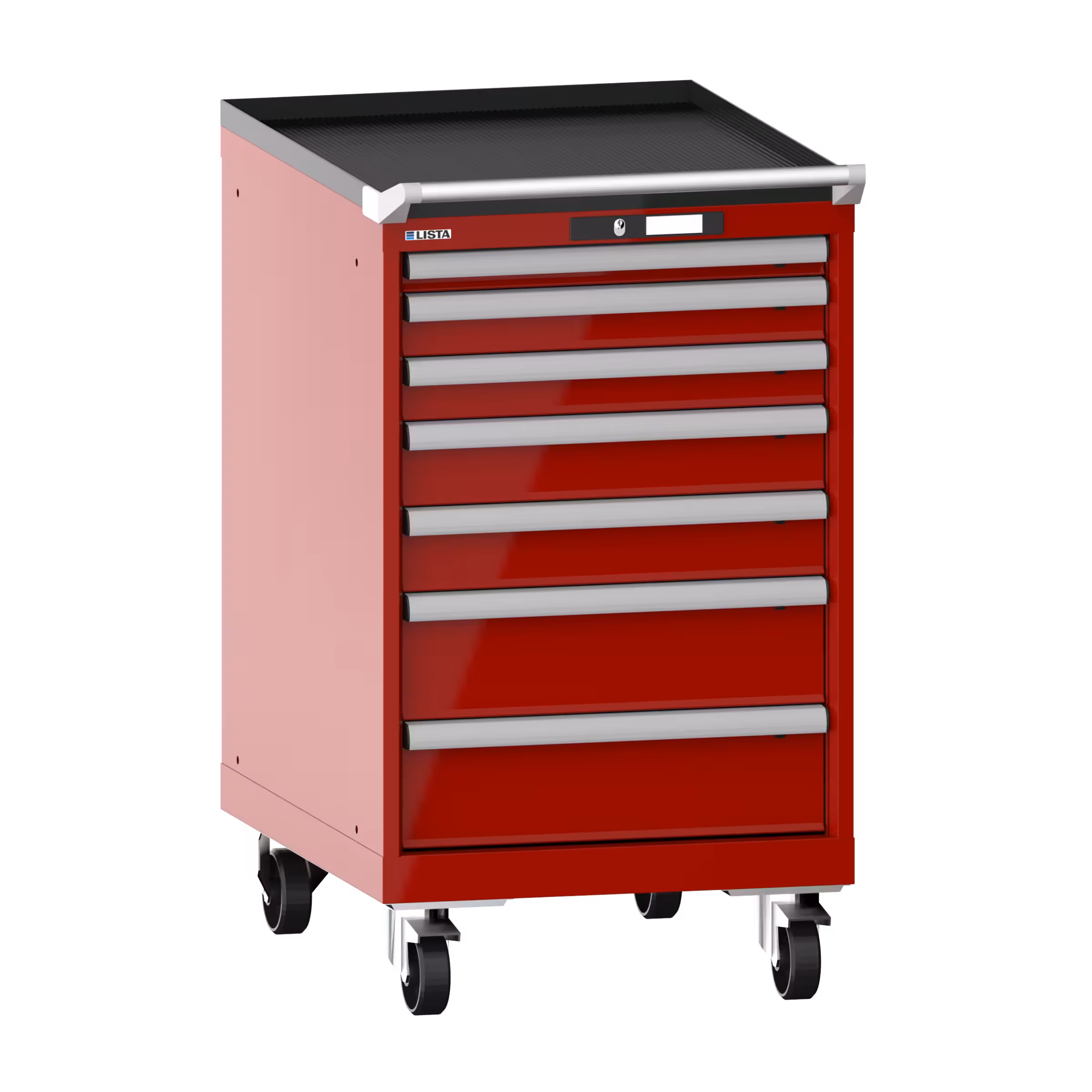 Schubladenschrank mobil 27x36E (BxTxH) 564x725x990mm 7 Schubladen (1x50/2x75/2x100/2x150) 75kg Nylonrollen Ø100mm AUTO Lock Rubinrot RAL 3003