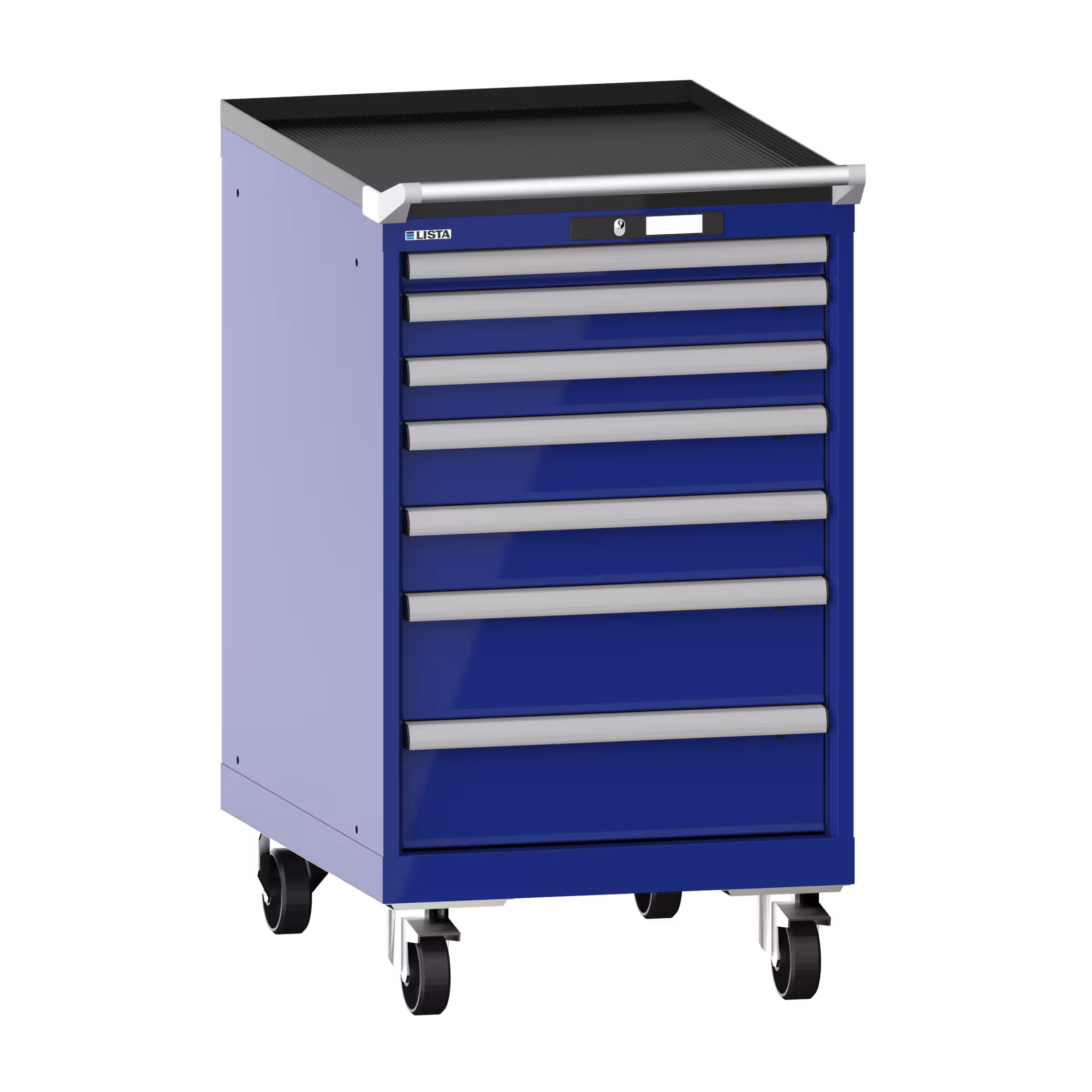 Schubladenschrank mobil 27x36E (BxTxH) 564x725x990mm 7 Schubladen (1x50/2x75/2x100/2x150) 75kg Nylonrollen Ø100mm AUTO Lock Ultramarinblau RAL 5002