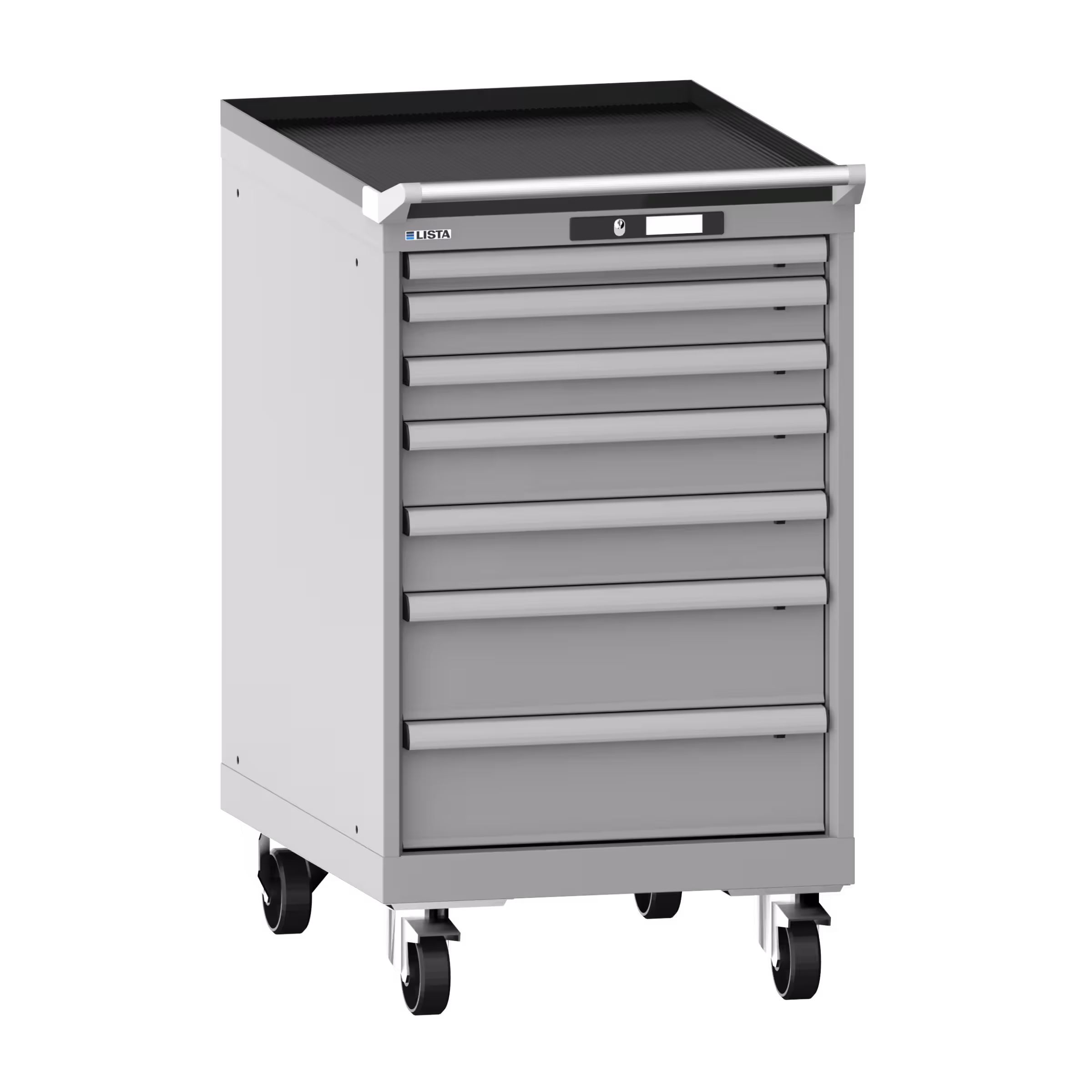 Schubladenschrank mobil 27x36E (BxTxH) 564x725x990mm 7 Schubladen (1x50/2x75/2x100/2x150) 75kg Nylonrollen Ø100mm AUTO Lock Weissaluminium RAL 9006