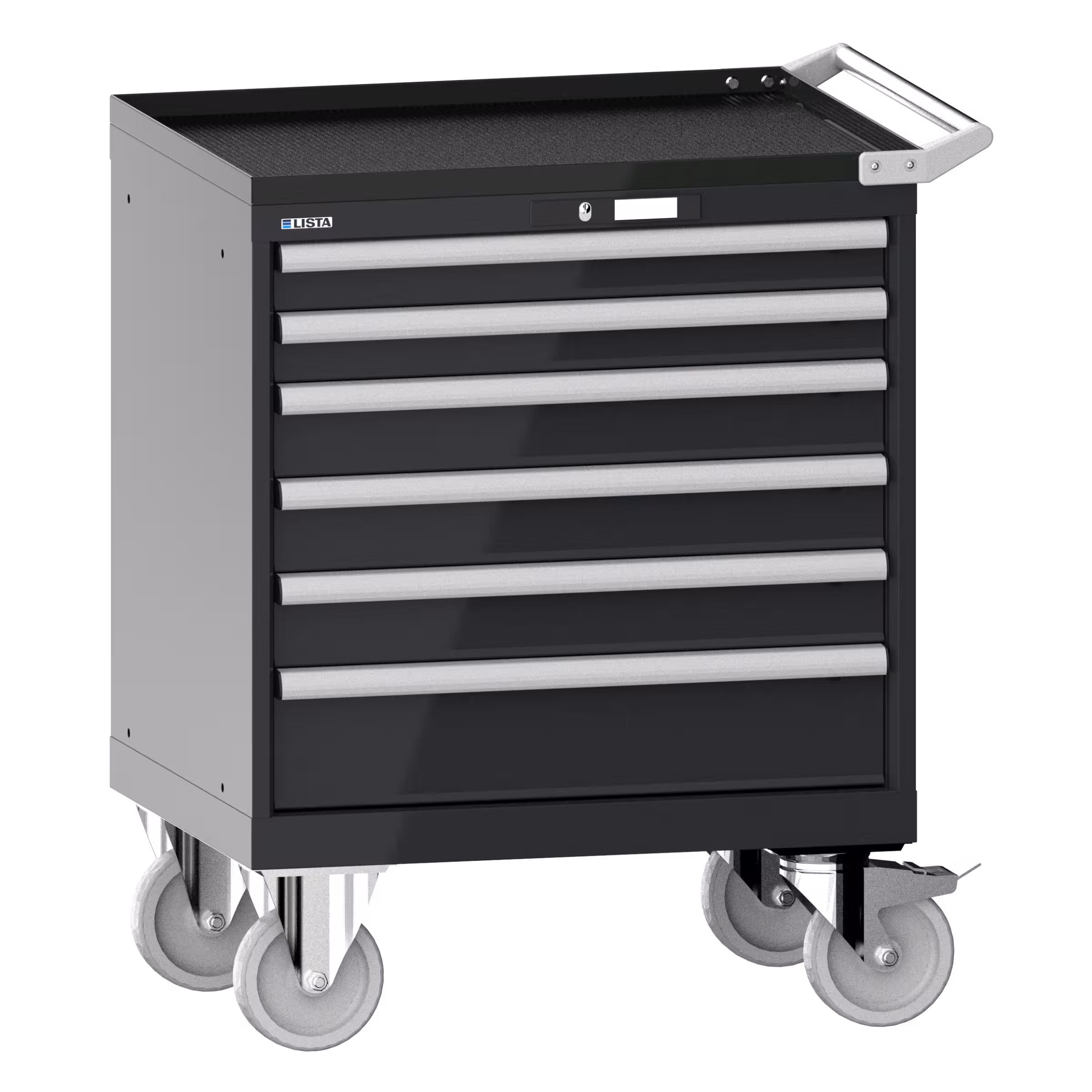 Schubladenschrank mobil 36x27E (BxTxH) 717x572x962mm 6 Schubladen (2x75/3x100/1x150) 75kg Gummirollen Ø160mm CODE Lock Anthrazitgrau RAL 7016