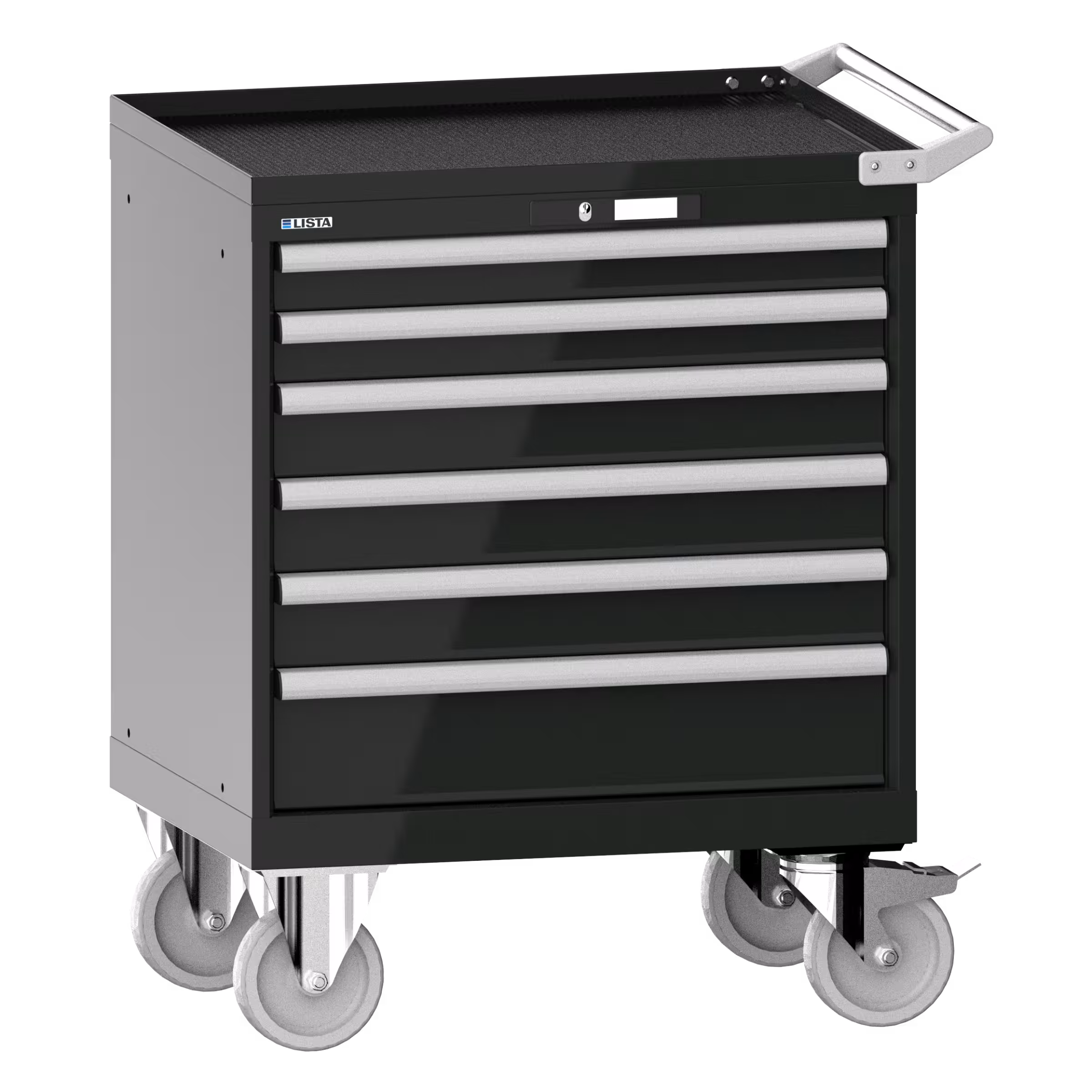 Schubladenschrank mobil 36x27E (BxTxH) 717x572x962mm 6 Schubladen (2x75/3x100/1x150) 75kg Gummirollen Ø160mm CODE Lock Schwarz NCS S 9000-N