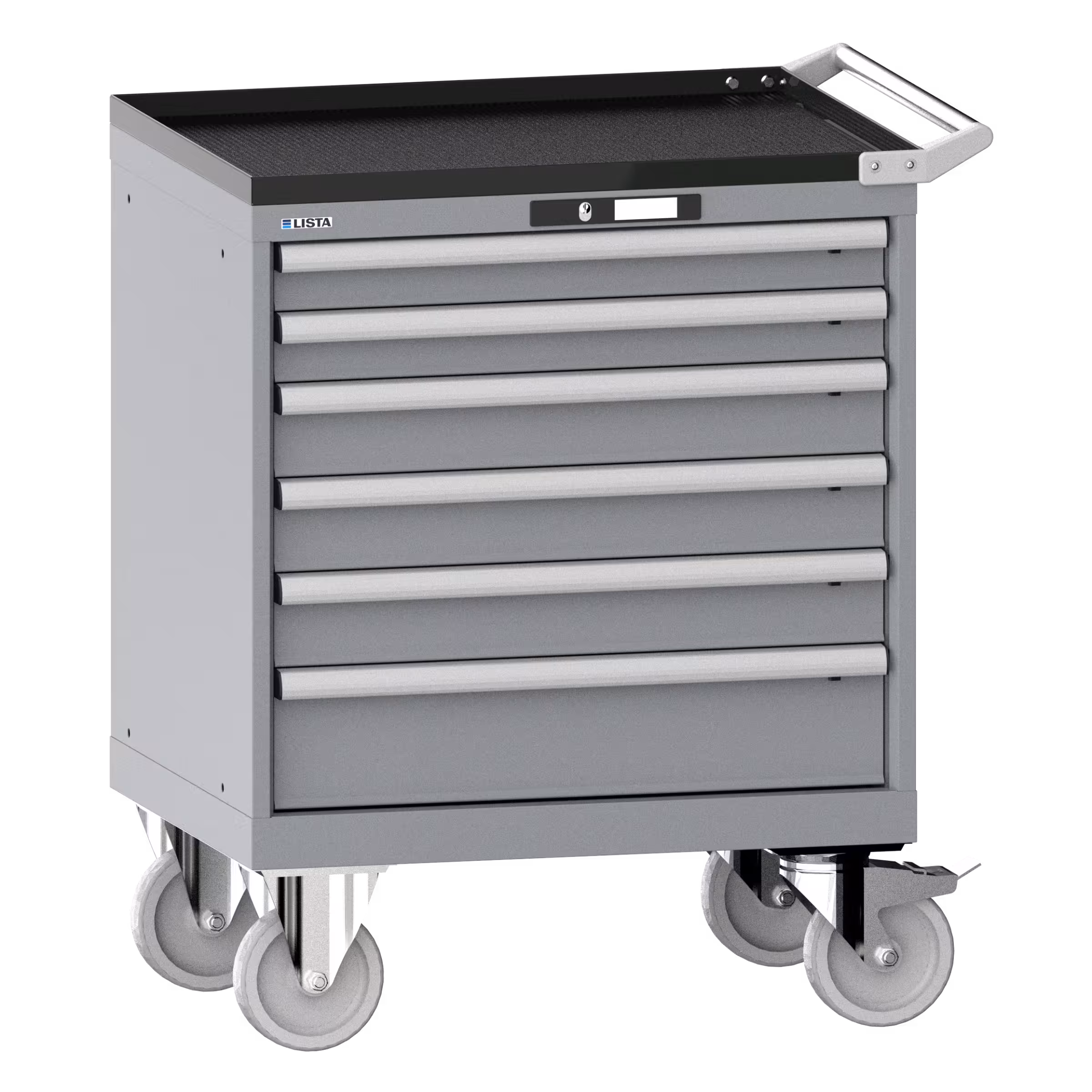 Schubladenschrank mobil 36x27E (BxTxH) 717x572x962mm 6 Schubladen (2x75/3x100/1x150) 75kg Gummirollen Ø160mm CODE Lock Taubengrau NCS S 4502-B