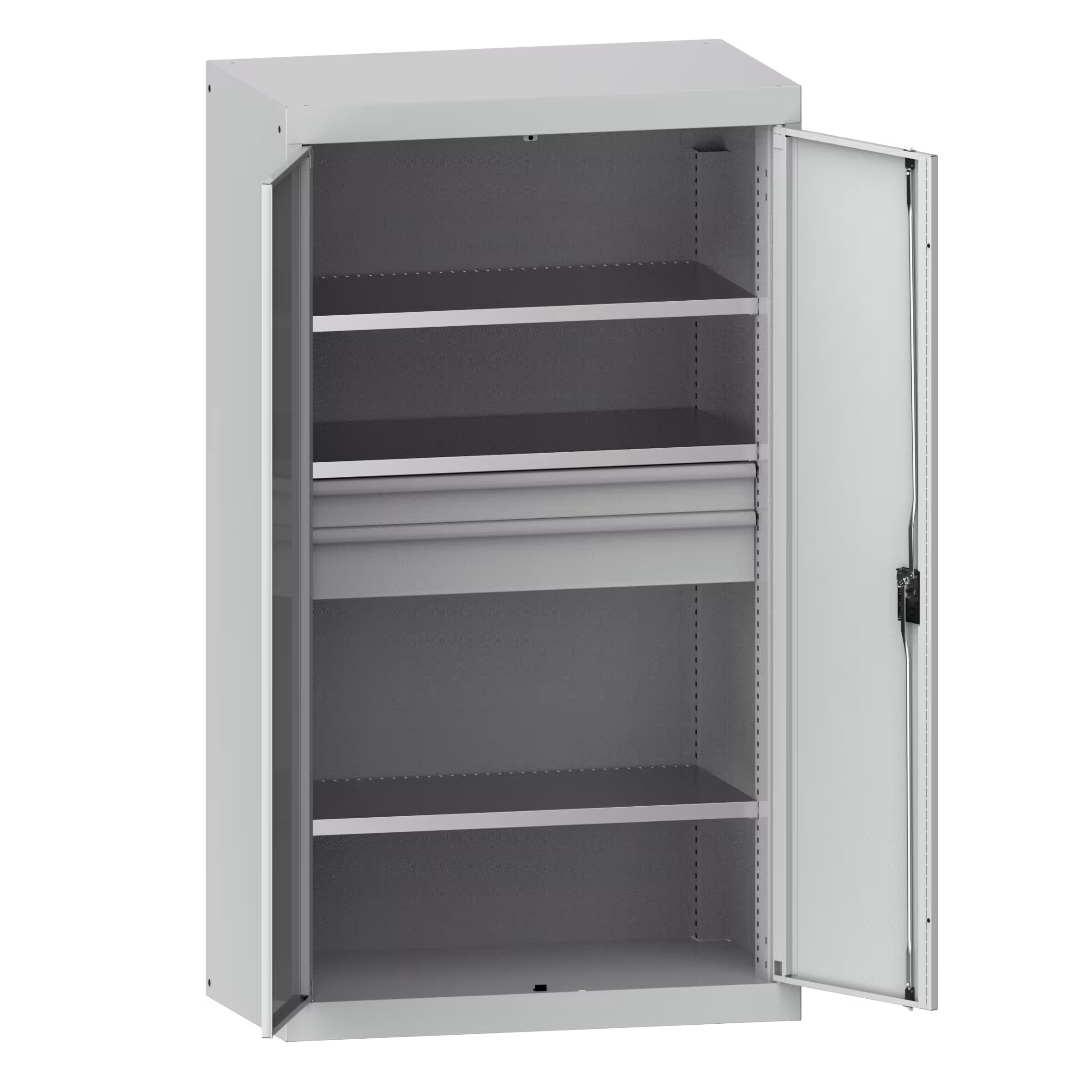 Schwerlastschrank mit 2 Vollblech-Flügeltüren 54x27E (BxTxH) 1100x641x1950mm 3 Verstellböden, 2 Schubladen KEY Lock Hellgrau NCS S 2000-N