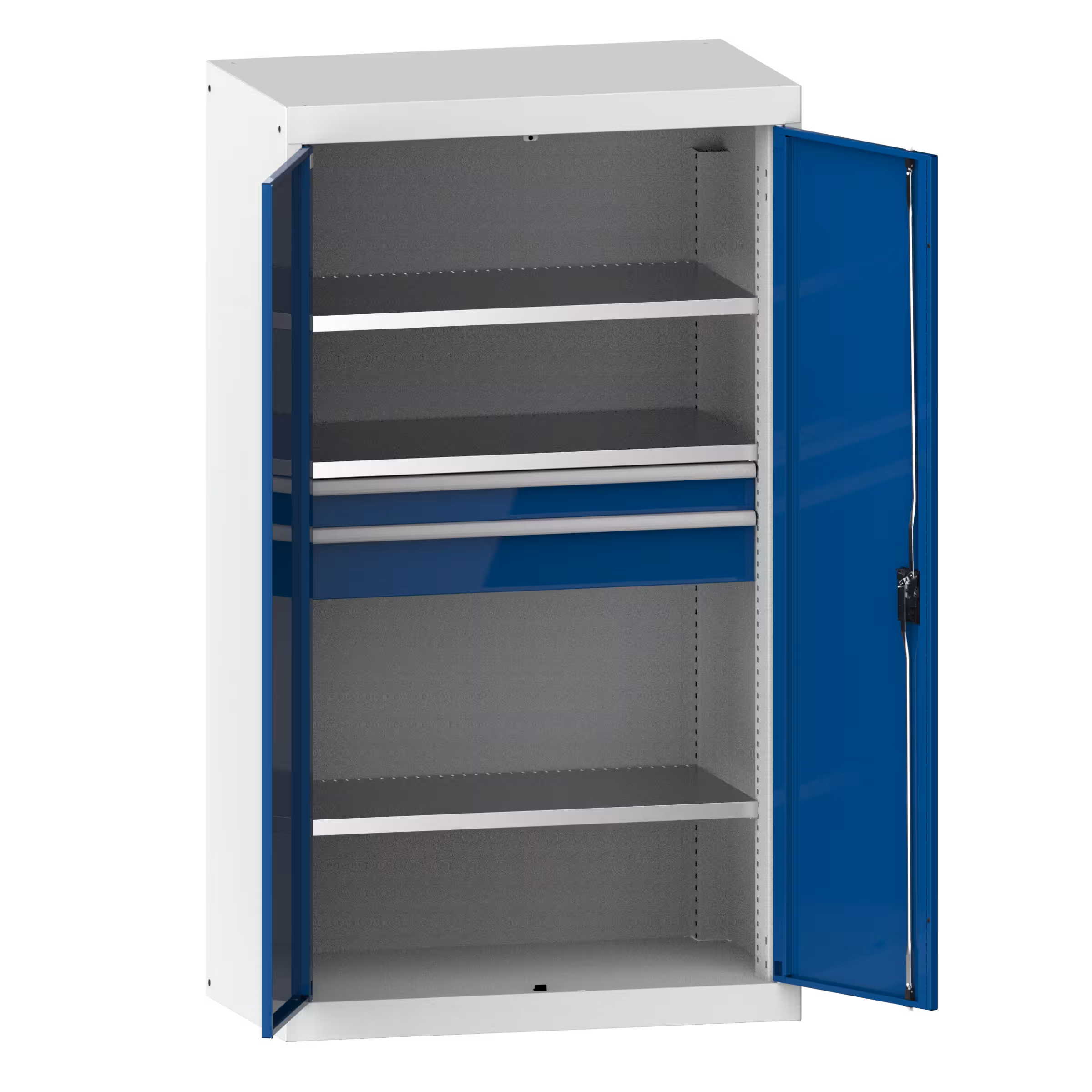 Schwerlastschränke mit Flügeltüren: Die Schränke sind ausgestattet mit: Verstellböden verzinkt, 35 mm stark, Auszugböden und Schubladen lackiert generell Grau, NCS 4502-B. Flügeltüren aus einem Stück gekantet, wahlweise aus Vollblech oder mit Sichtfenstern. Schliessungen KEY Lock, CODE Lock oder RFID Lock möglich.