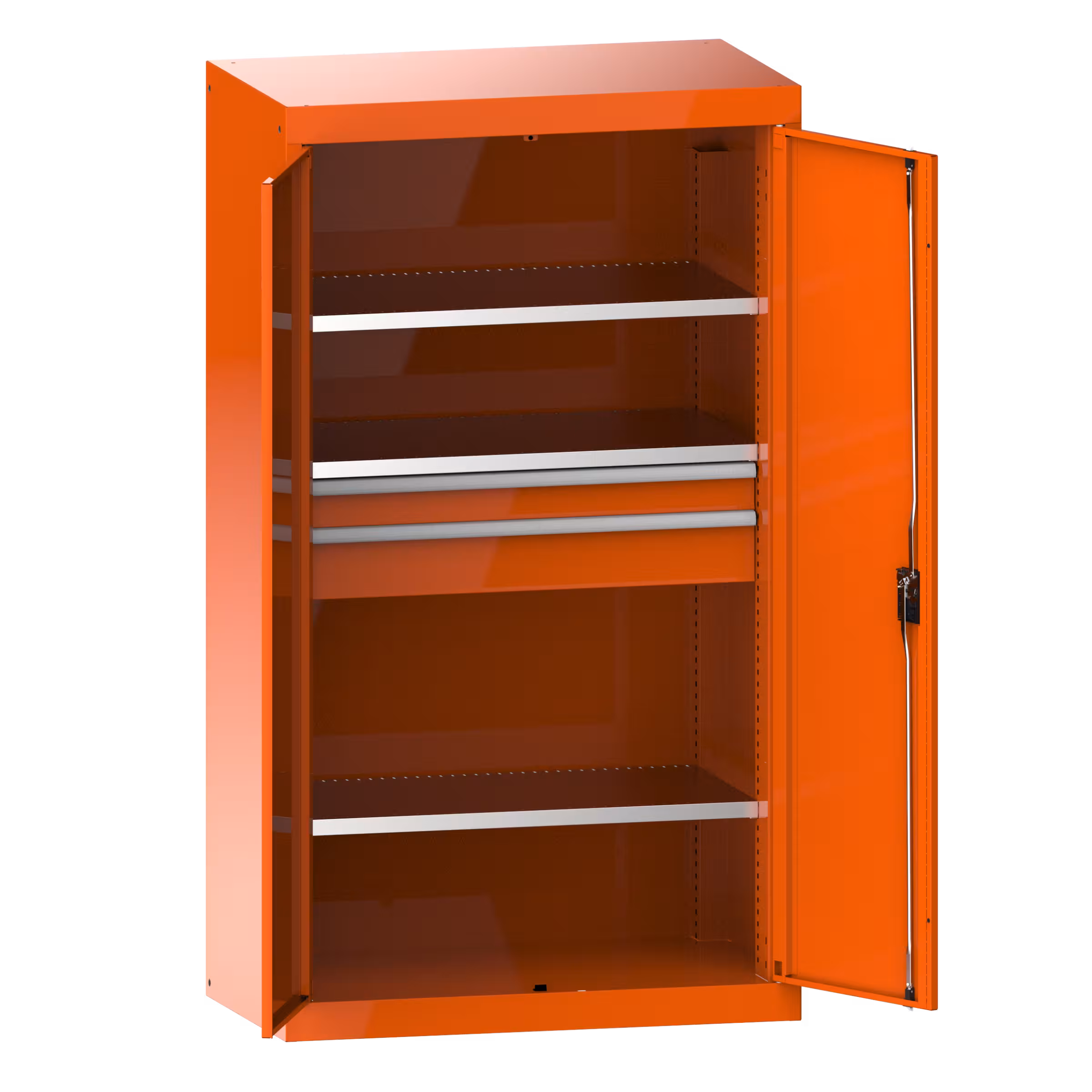 Schwerlastschränke mit Flügeltüren: Die Schränke sind ausgestattet mit: Verstellböden verzinkt, 35 mm stark, Auszugböden und Schubladen lackiert generell Grau, NCS 4502-B. Flügeltüren aus einem Stück gekantet, wahlweise aus Vollblech oder mit Sichtfenstern. Schliessungen KEY Lock, CODE Lock oder RFID Lock möglich.